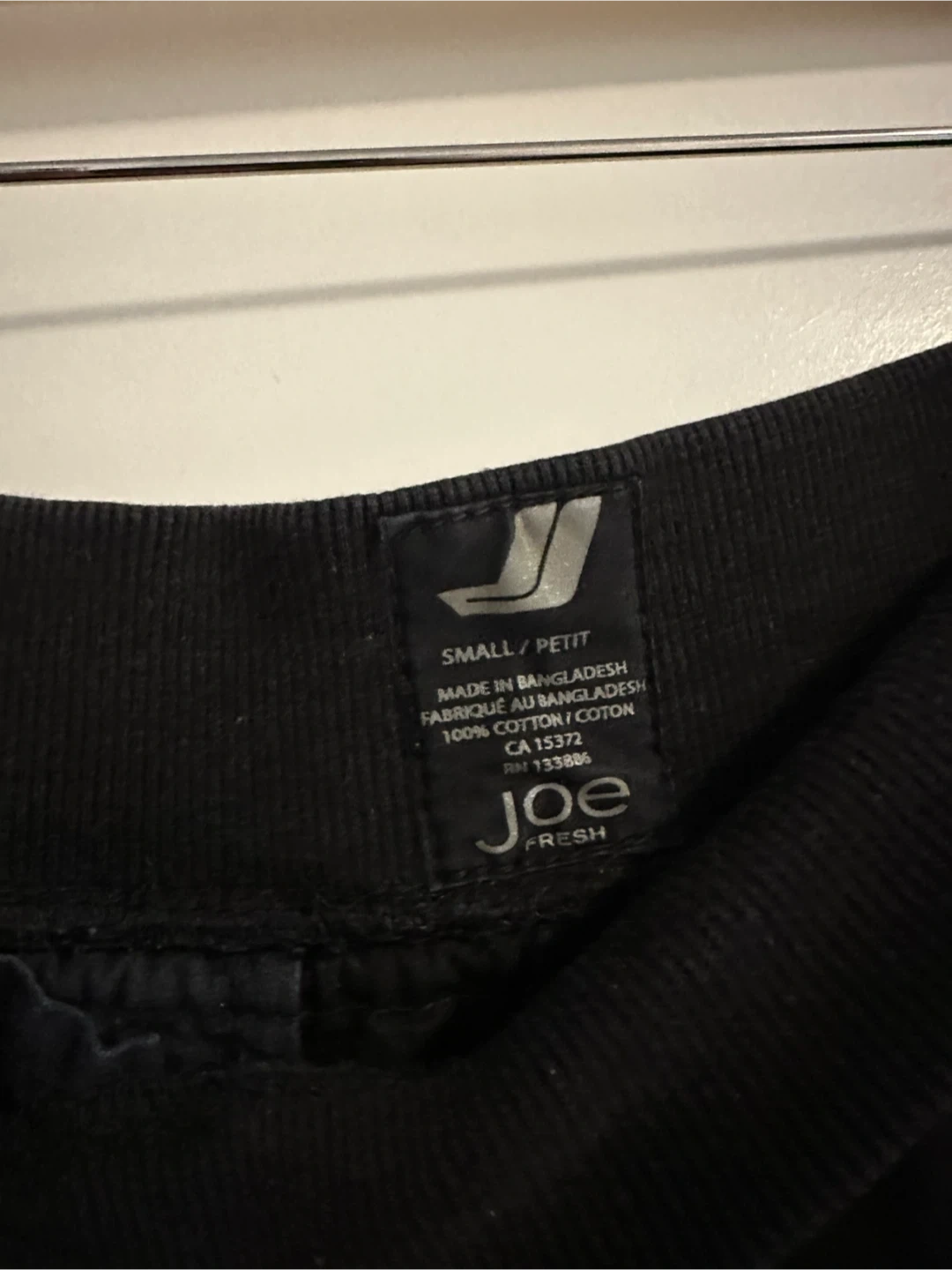 Selling a pair of Joe Fresh black shorts in size small. They're made of 100% cotton and are in great condition. Perfect for casual wear!