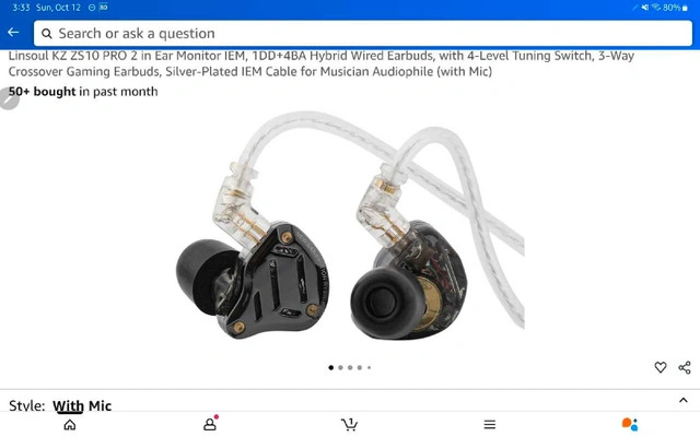 Linsoul KZ ZS10 PRO 2 in Ear Monitor IEM, 1DD+4BA Hybrid Wired Earbuds, with 4-Level Tuning Switch, 3-Way Crossover Gaming Earbuds, Silver-Plated IEM Cable for Musician Audiophile (with Mic). Fantastic sounding, also good for gaming. Used once and cleaned. I prefer my audeze IEM's.