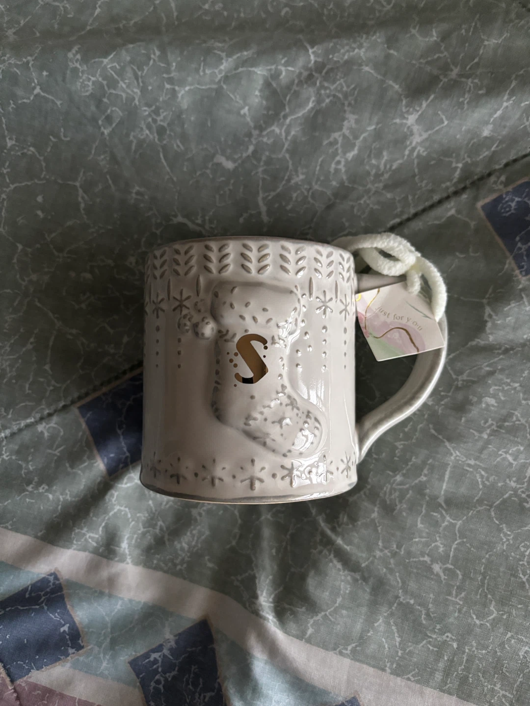 Here's a cute mug featuring a Christmas stocking design with the initial 'S'! It's perfect for adding a festive touch to your morning coffee or hot chocolate