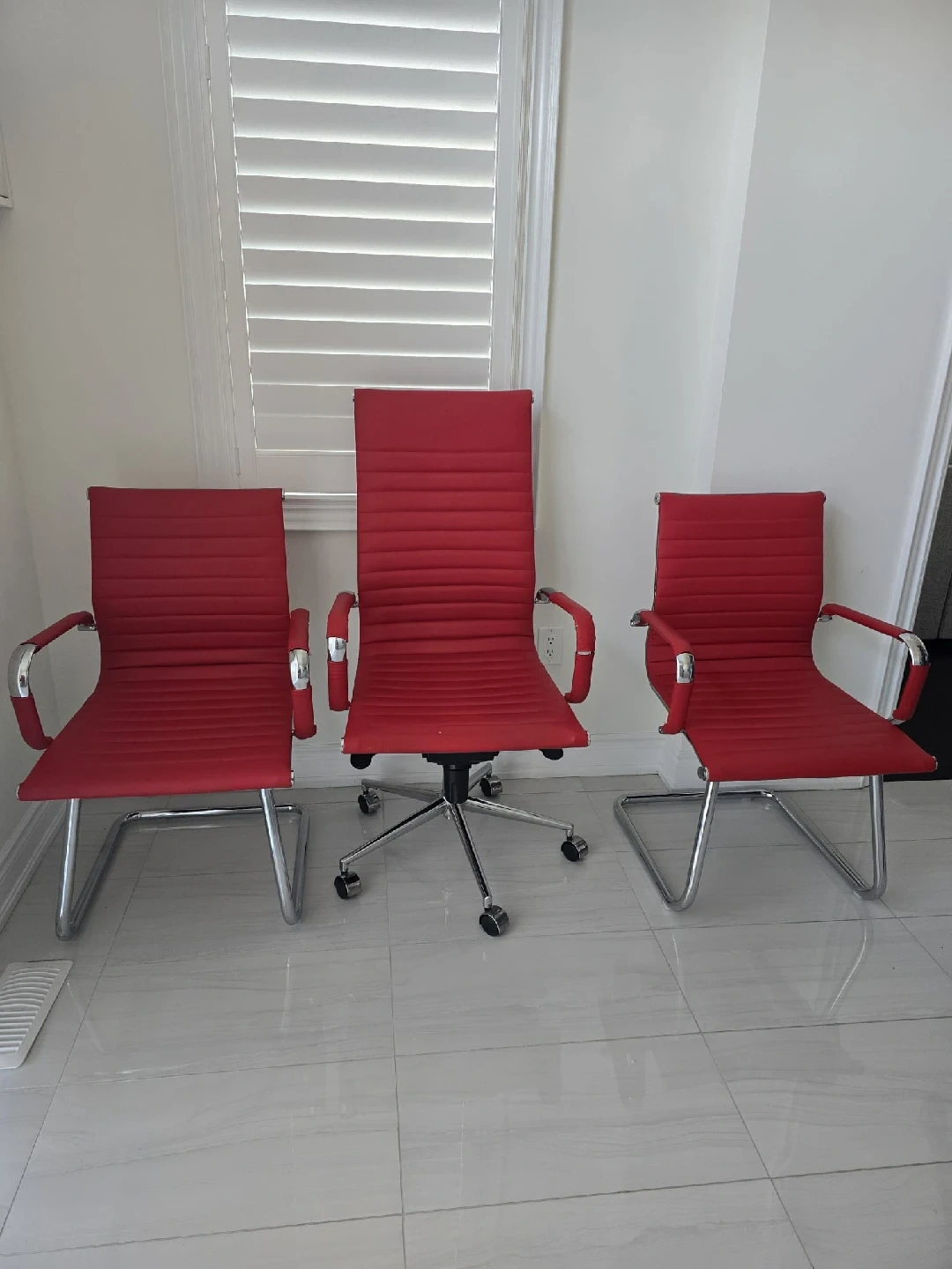 Here's a vibrant red office chair that will add a pop of colour to any workspace! It's in great condition and ready for a new home. Perfect for home offices or adding a stylish touch to your desk setup