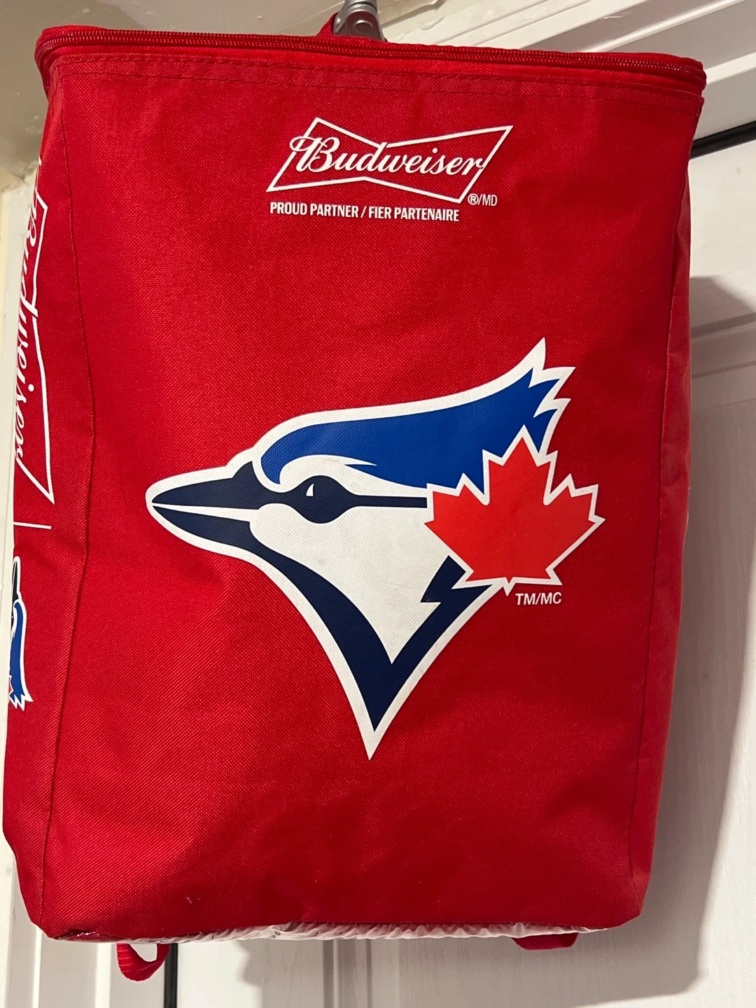 Red Budweiser cooler backpack featuring the Toronto Blue Jays logo. Perfect for keeping your drinks cold on the go.