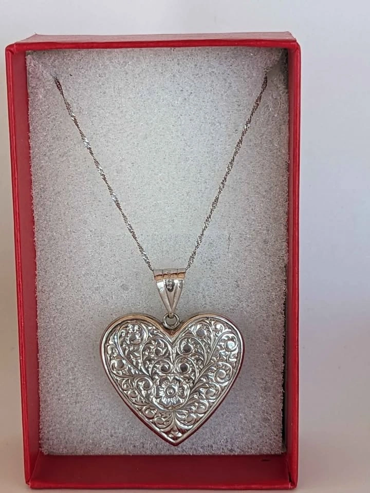This graceful necklace features a heart-shaped pendant with intricate filigree detailing, crafted in genuine 10K white gold. Suspended from a fine matching chain, the piece exudes timeless elegance and romantic charm. Its lightweight design makes it perfect for everyday wear or as a meaningful gift.