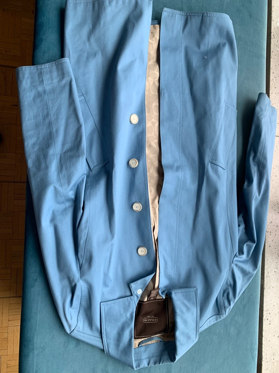 Selling a gently used Coach jacket in a lovely light blue colour. It's a size small and made from 100% cotton with a polyester/cotton lining. Perfect for spring or fall weather!