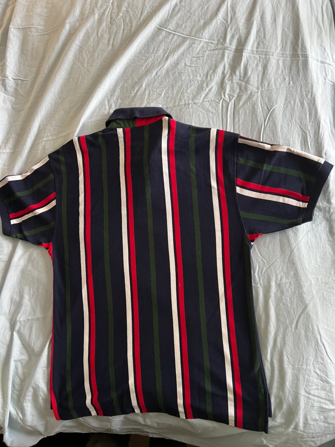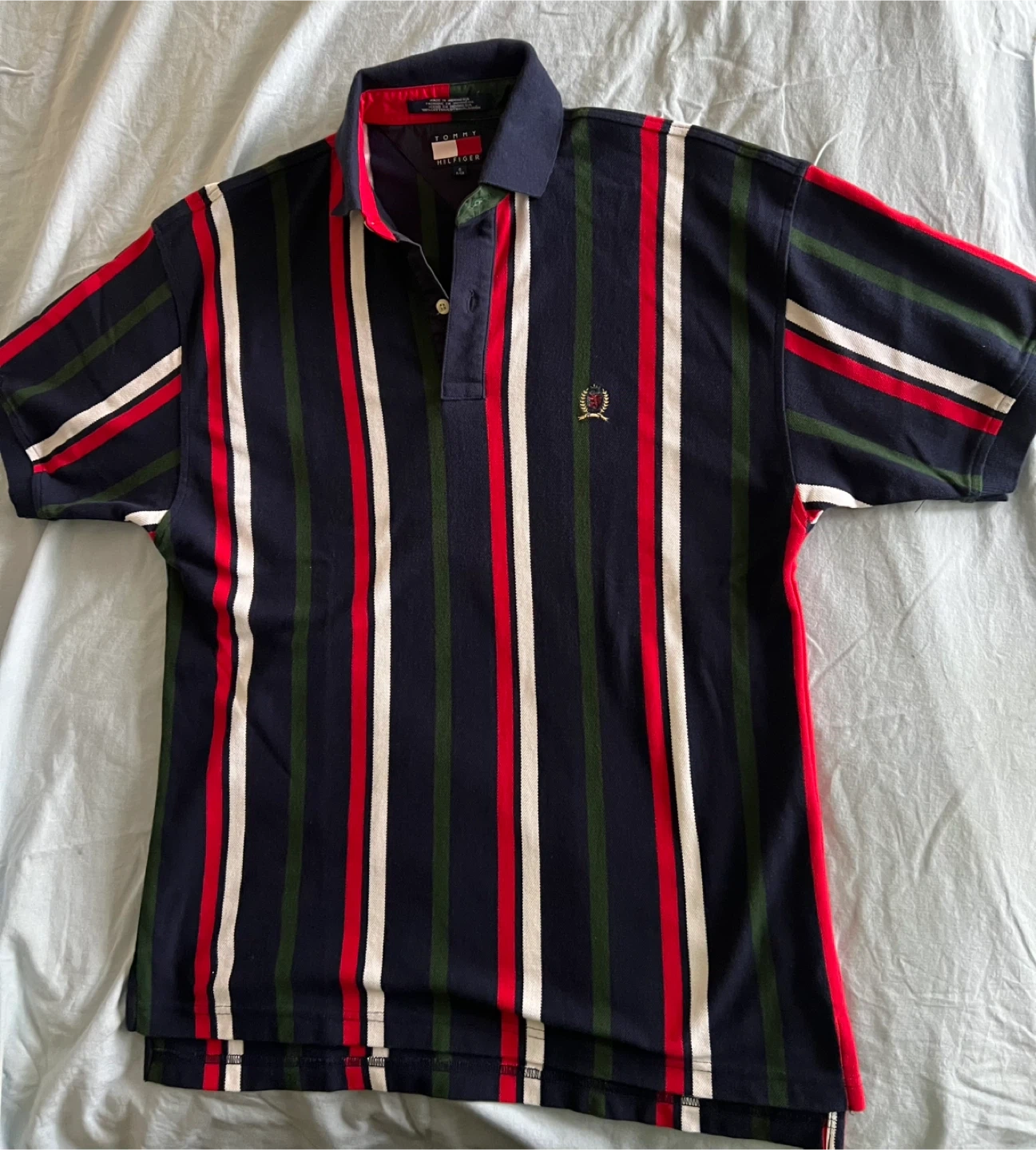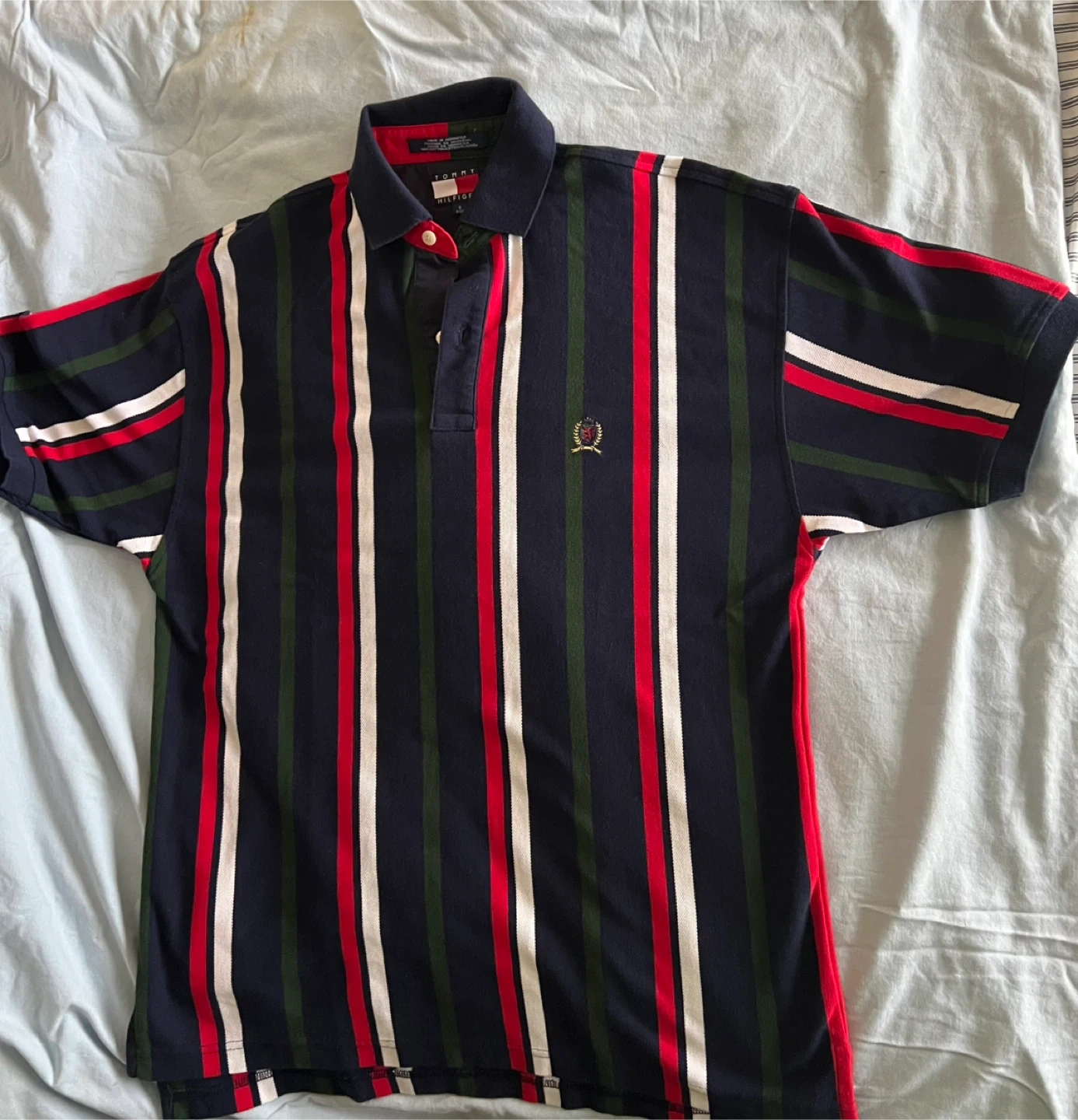 Selling a Tommy Hilfiger polo shirt with a cool striped design! It's a size small and made of 100% cotton. Perfect for a casual, stylish look