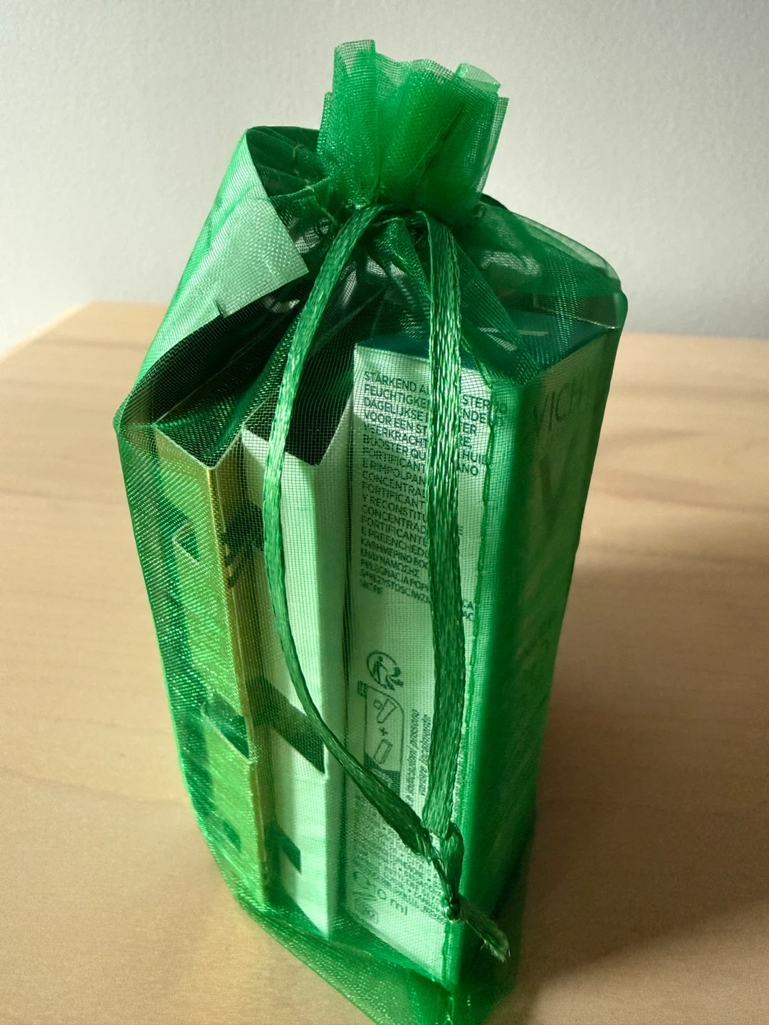 1000+Selling a beauty set that includes Vichy Minéral 89 and Lancôme La vie est belle. The set comes in a green mesh bag, perfect for gifting or treating yourself!