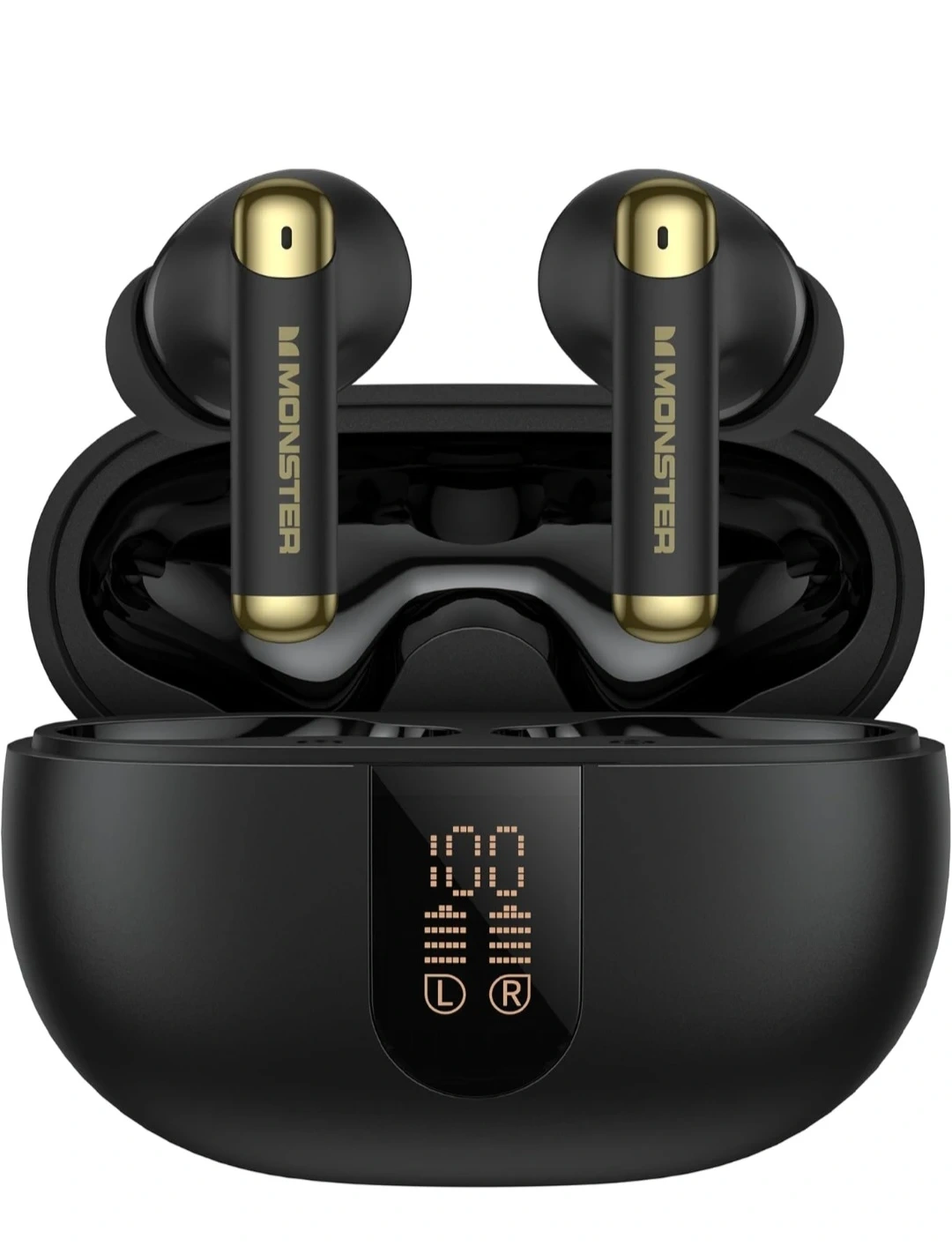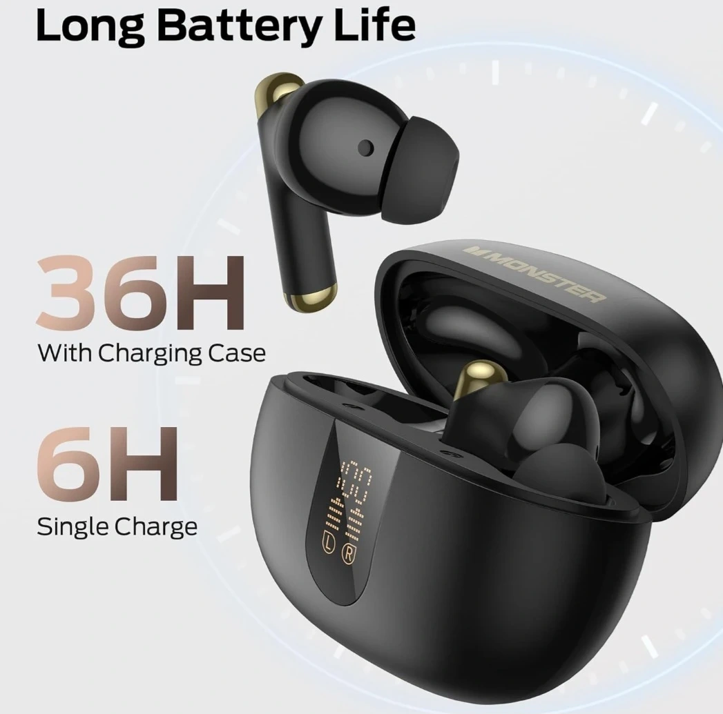 Selling a pair of black Monster wireless earbuds. They feature a digital power display on the case and earbuds, showing the battery levels. You can get 6-7 hours of playtime on a single charge, and up to 36 hours with the charging case