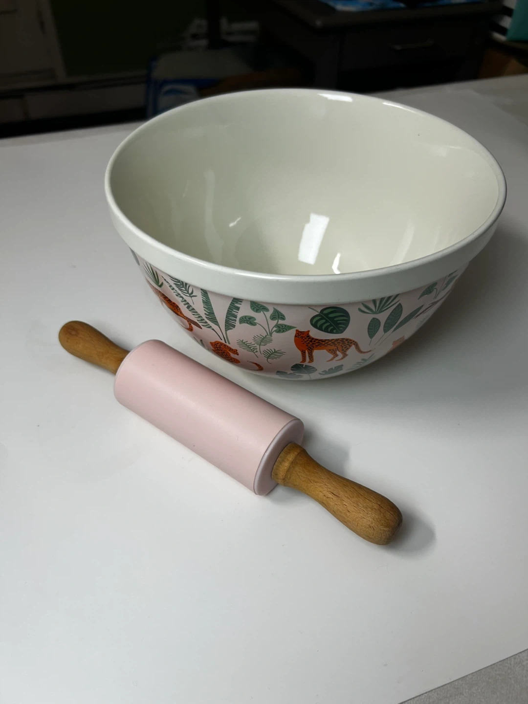 Selling a cute bowl from The Bake Shop, along with a pink rolling pin. The bowl has a fun jungle theme with tigers and plants. Perfect for baking or mixing up your favourite recipes!