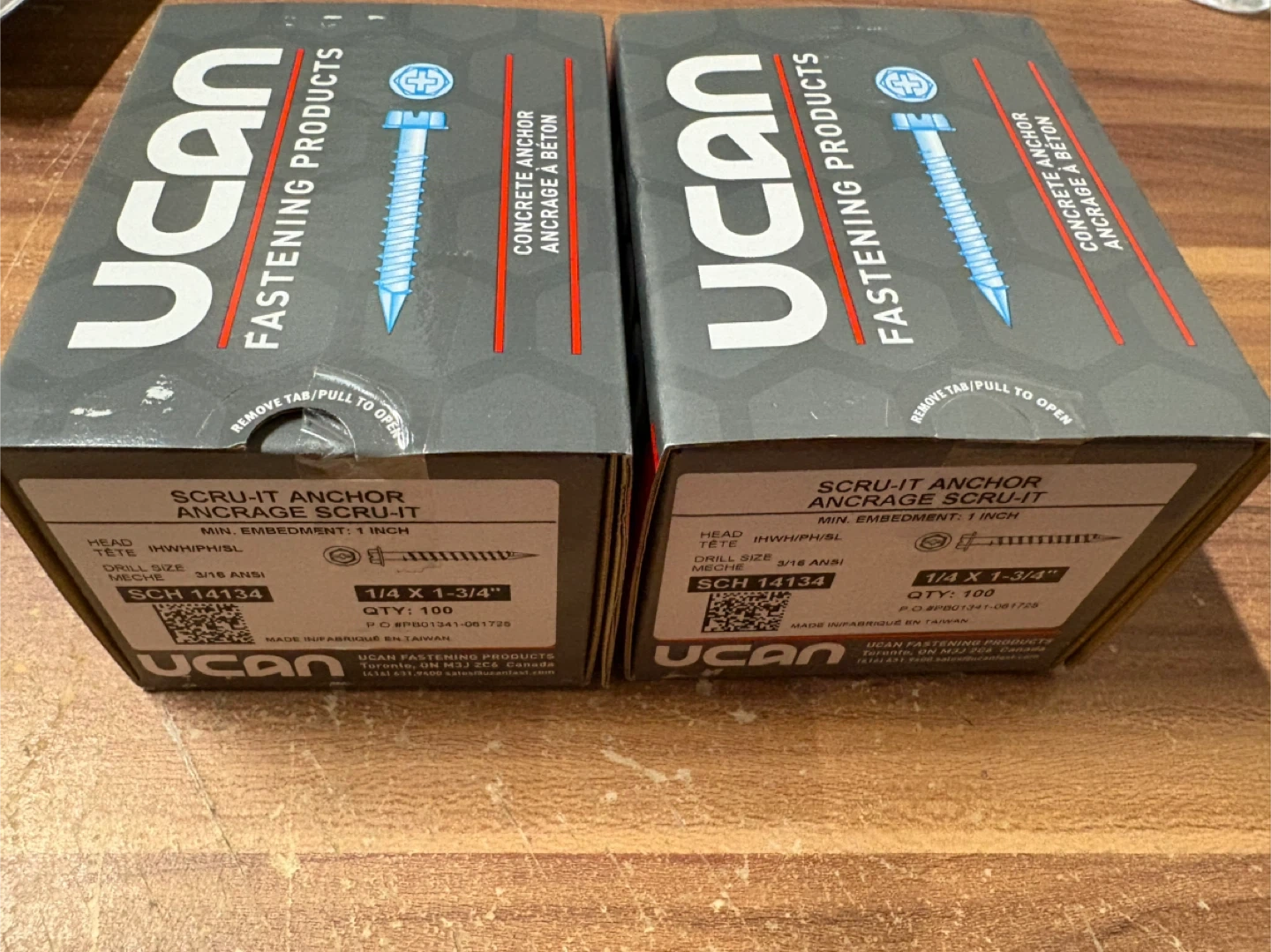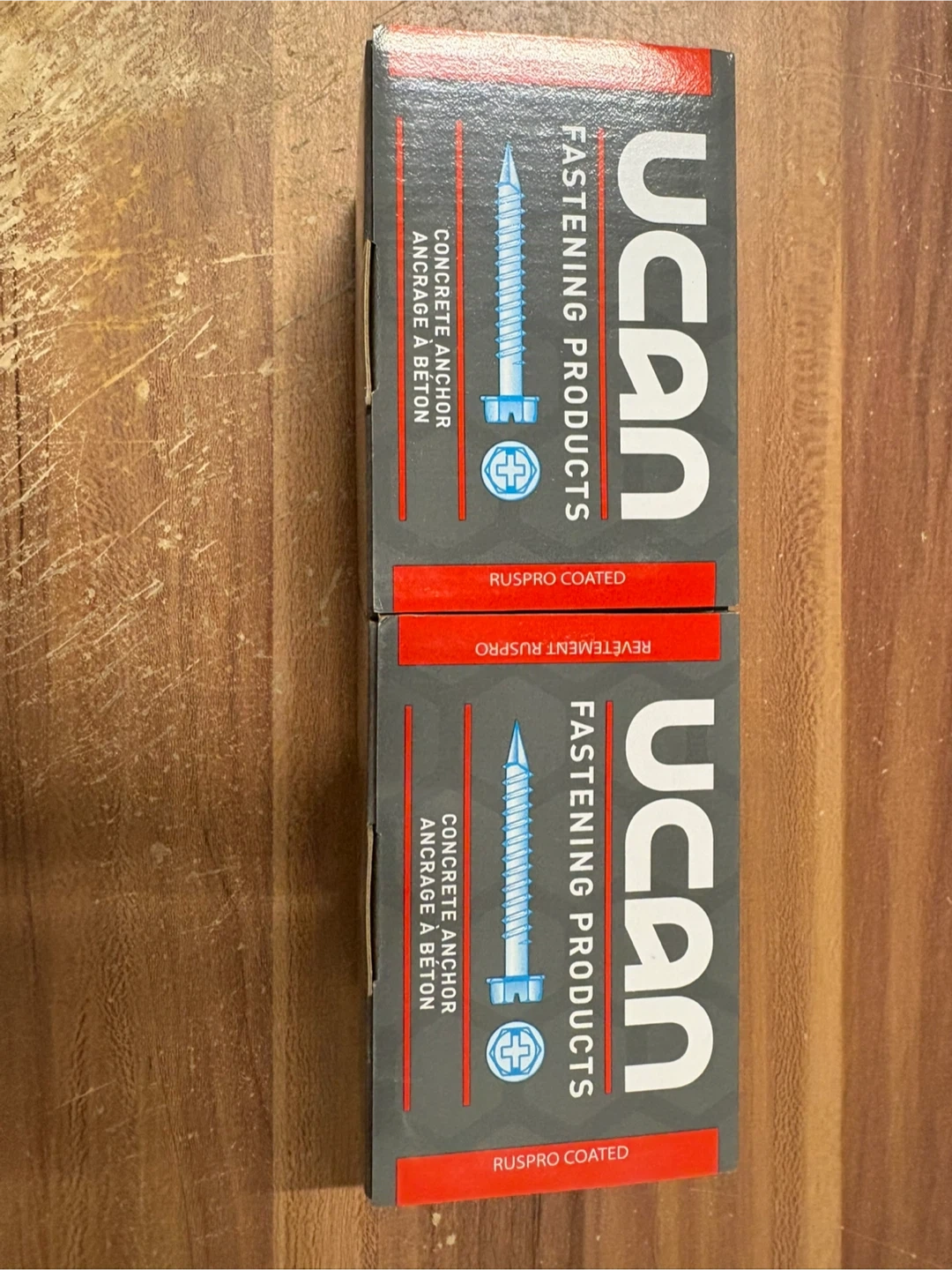 Two boxes of UCAN concrete anchors available. Each box contains 100 anchors, sized at 1/4 x 1-3/4 inch. Perfect for your fastening needs!