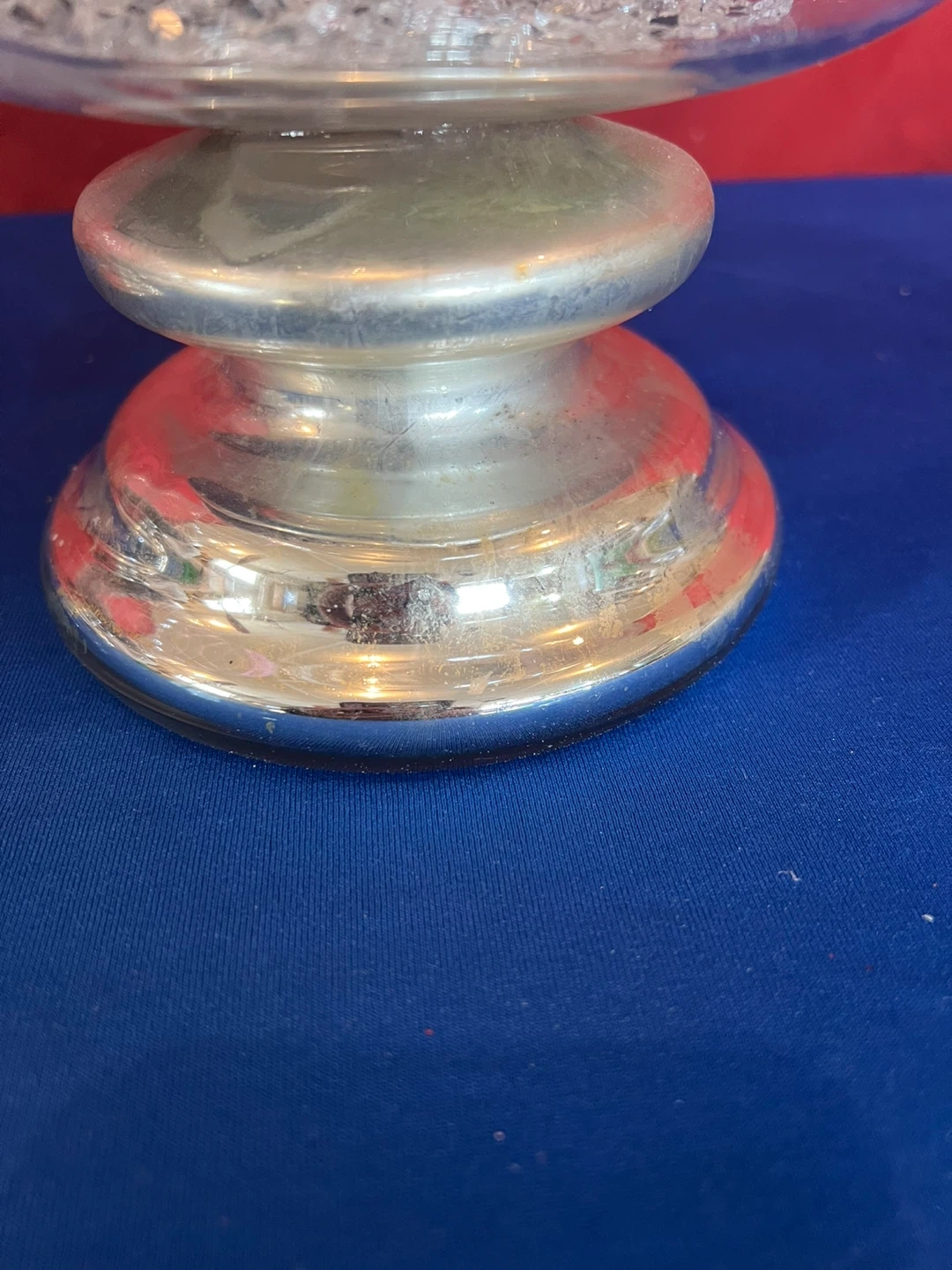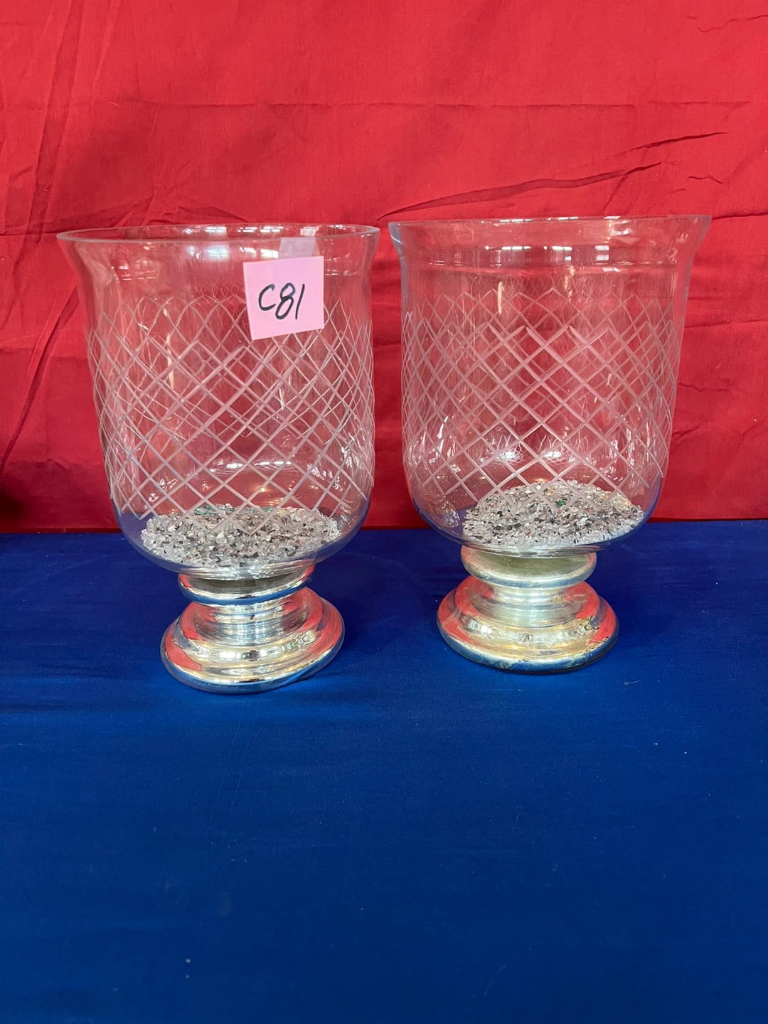 Selling a pair of clear glass pedestal vases. They have a silver-coloured base and a diamond pattern on the glass. (2nd photo shows some discoloration on one vase, which a beautiful bow will cover it). Approximately 11 1/2” tall, 8” circumference. Perfect for adding a touch of elegance to any room on any occasion!