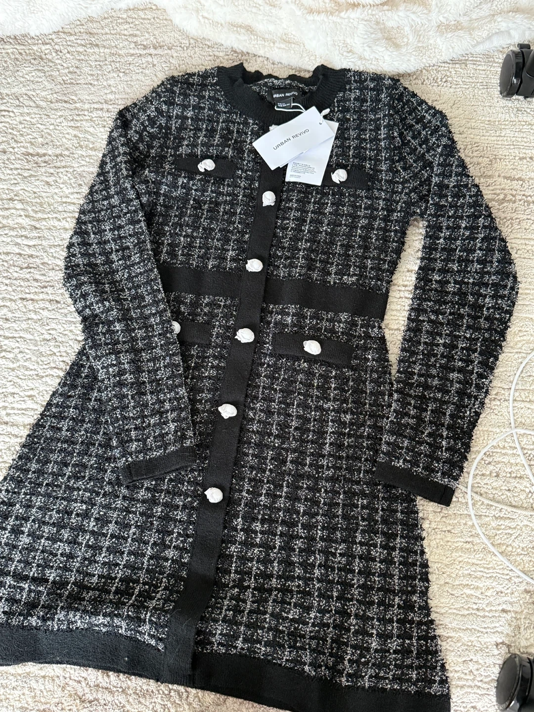 This is a beautiful tweed dress from Urban Revivo. It's a size M (US6/UK10/EUR38). The dress features a classic design with a button-down front and a flattering silhouette. Perfect for adding a touch of sophistication to your wardrobe!