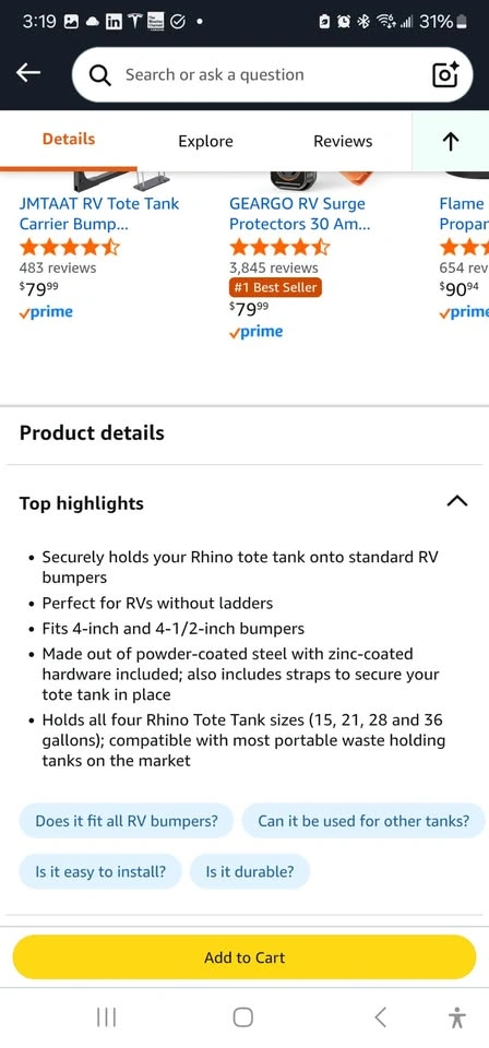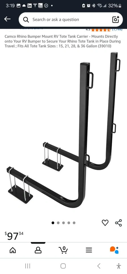 Mounts directly onto your RV bumper to secure your Rhino tote tank in place during travel. Fits all tote tank sizes: 15, 21, 28, & 36 gallon. Securely holds your Rhino tote tank onto standard RV bumpers. Perfect for RVs without ladders. Fits 4-inch and 4-1/2-inch bumpers. Made out of powder-coated steel with zinc-coated hardware included; also includes straps to secure your tote tank in place. Compatible with most portable waste holding tanks on the market.