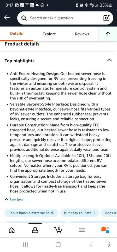 Multi-Selection: Our heated sewer hose for rv camper design has three lengths of 10ft, 15ft and 20ft for selection. Choose heating sewage hose suitable for you according to your needs.