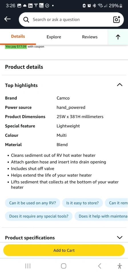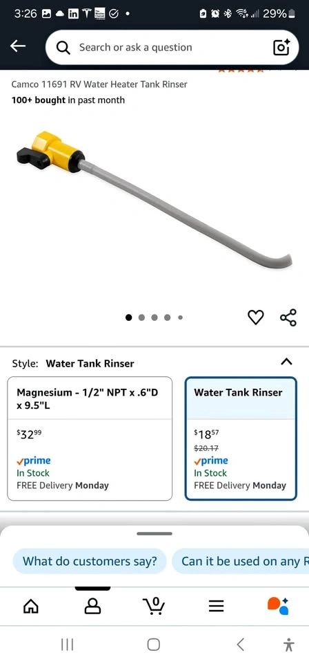 Camco's RV Water Heater Tank Rinser helps extend the life of your water heater. The rinser lifts sediment that collects at the bottom of your hot water heater and washes it out of your water heater tank. Just hook a garden hose to the rinser and insert it into the water heater drain. The rinser has a shut off valve as well. Brand new from Amazon. $15 OBO