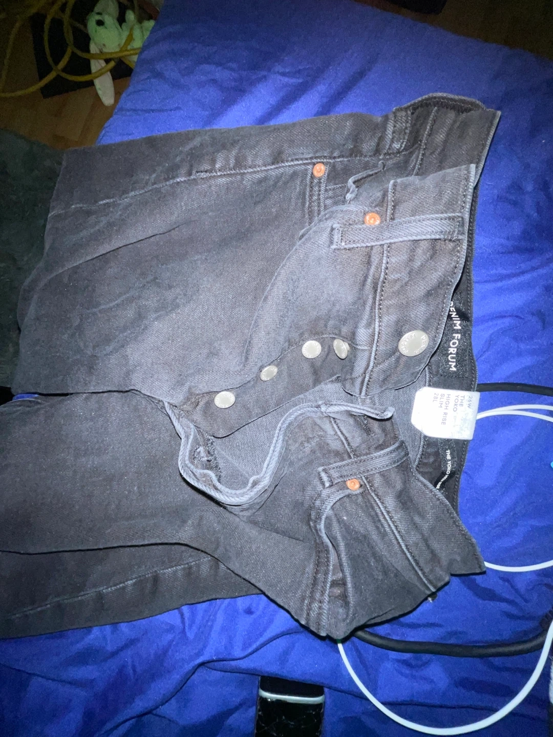 These are black Aritzia Forum jeans. They're made of denim with a button-fly closure. The waist size is 26.