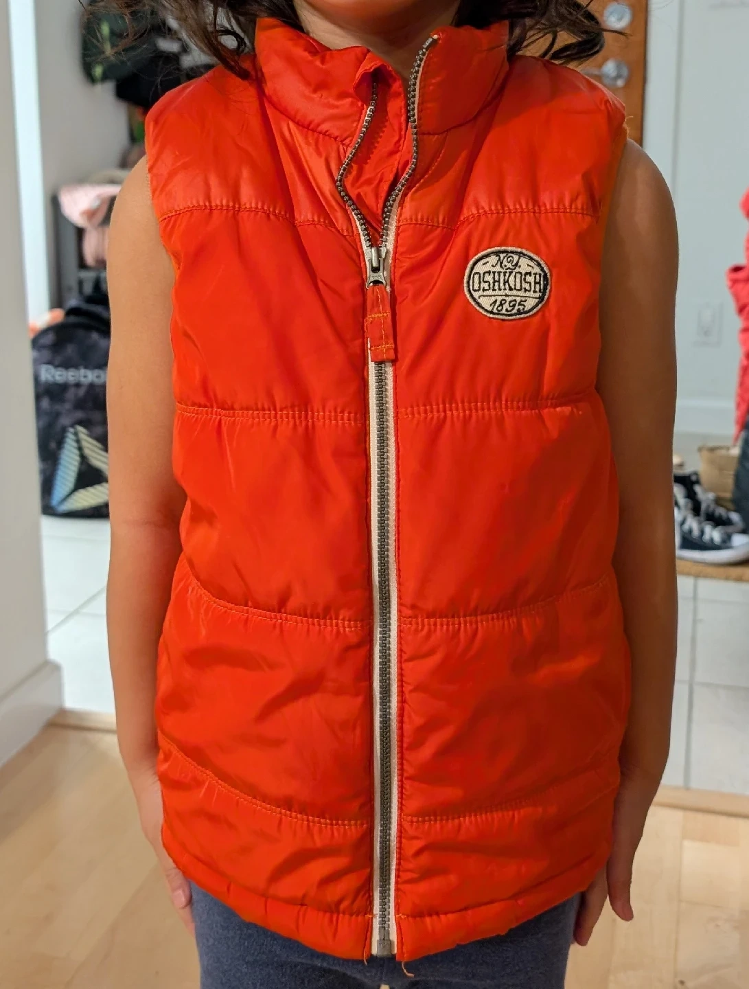 Selling a bright orange puffer vest from OshKosh B'gosh! It's in great shape and perfect for layering on those chilly days. The vest features a full zipper and the classic OshKosh logo.