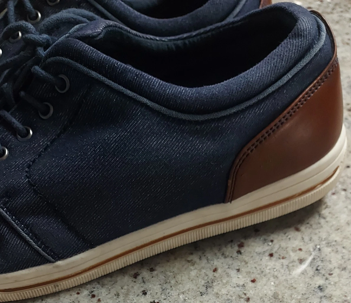 Selling a pair of men's casual shoes in a stylish blue denim material. These shoes feature a brown leather-look accent on the heel and a comfortable white sole. They're perfect for everyday wear!