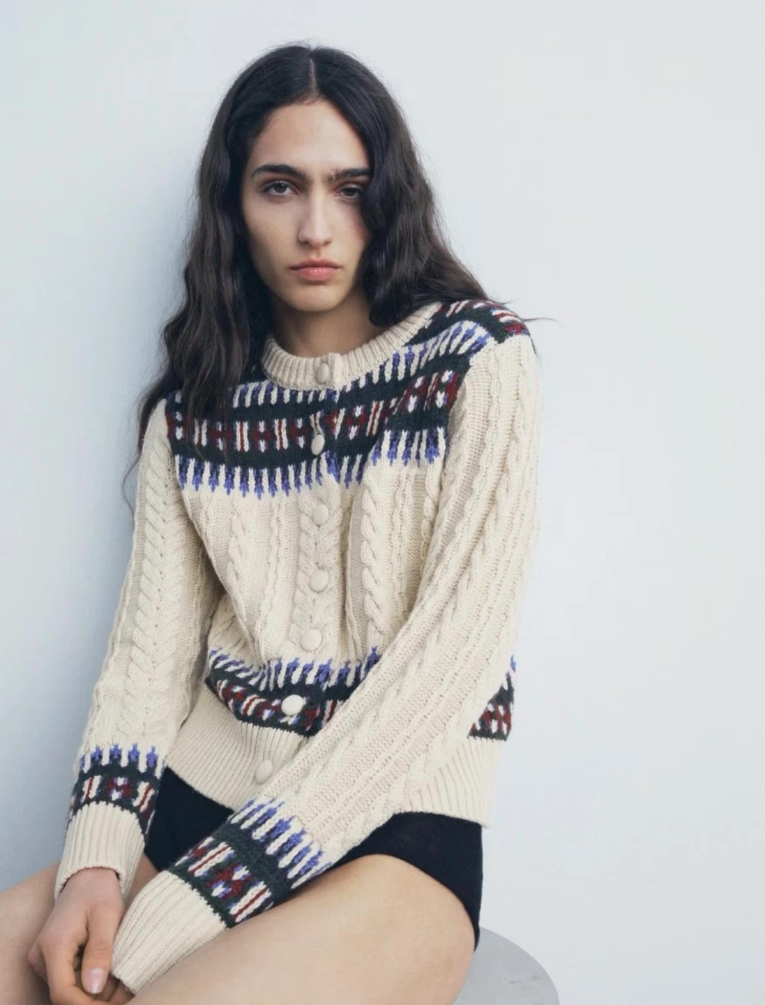 Selling a Zara knit jacquard cardigan in size M. It's a beautiful piece with a unique pattern and cable knit texture. Perfect for layering!