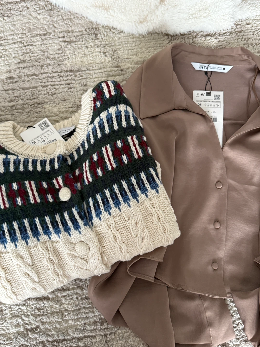 Selling a Zara knit jacquard cardigan in size M. It's a beautiful piece with a unique pattern and cable knit texture. Perfect for layering!