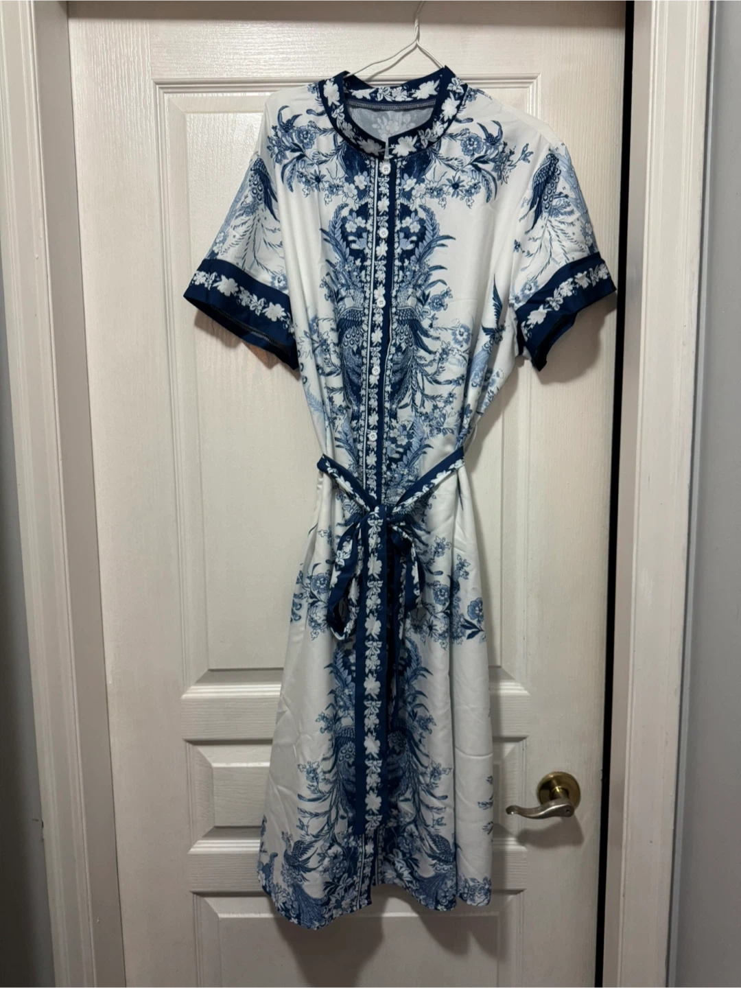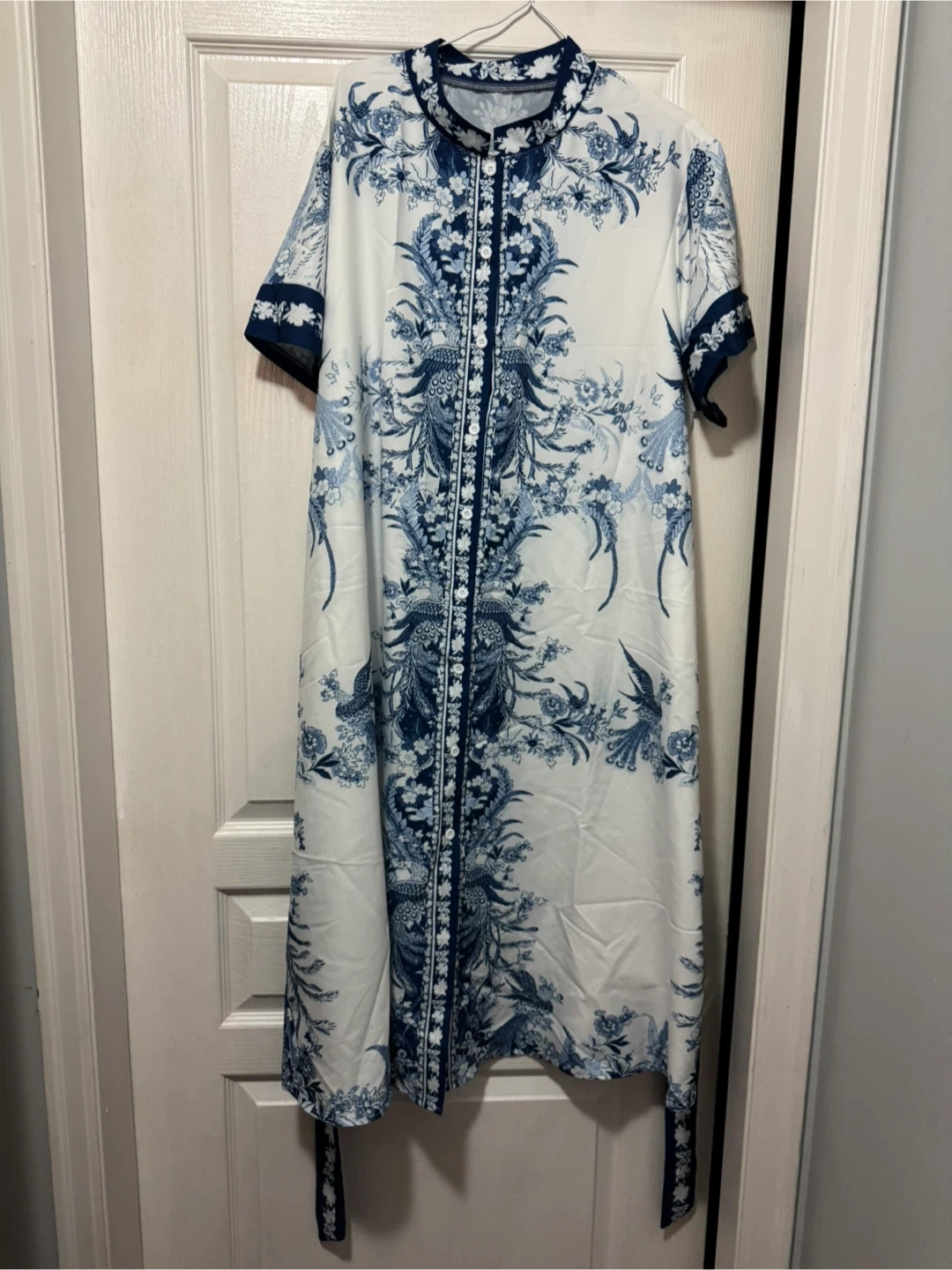 Beautiful blue and white floral print dress! It features a tie around the waist and a unique design that's sure to turn heads. Perfect for any special occasion size 2x.