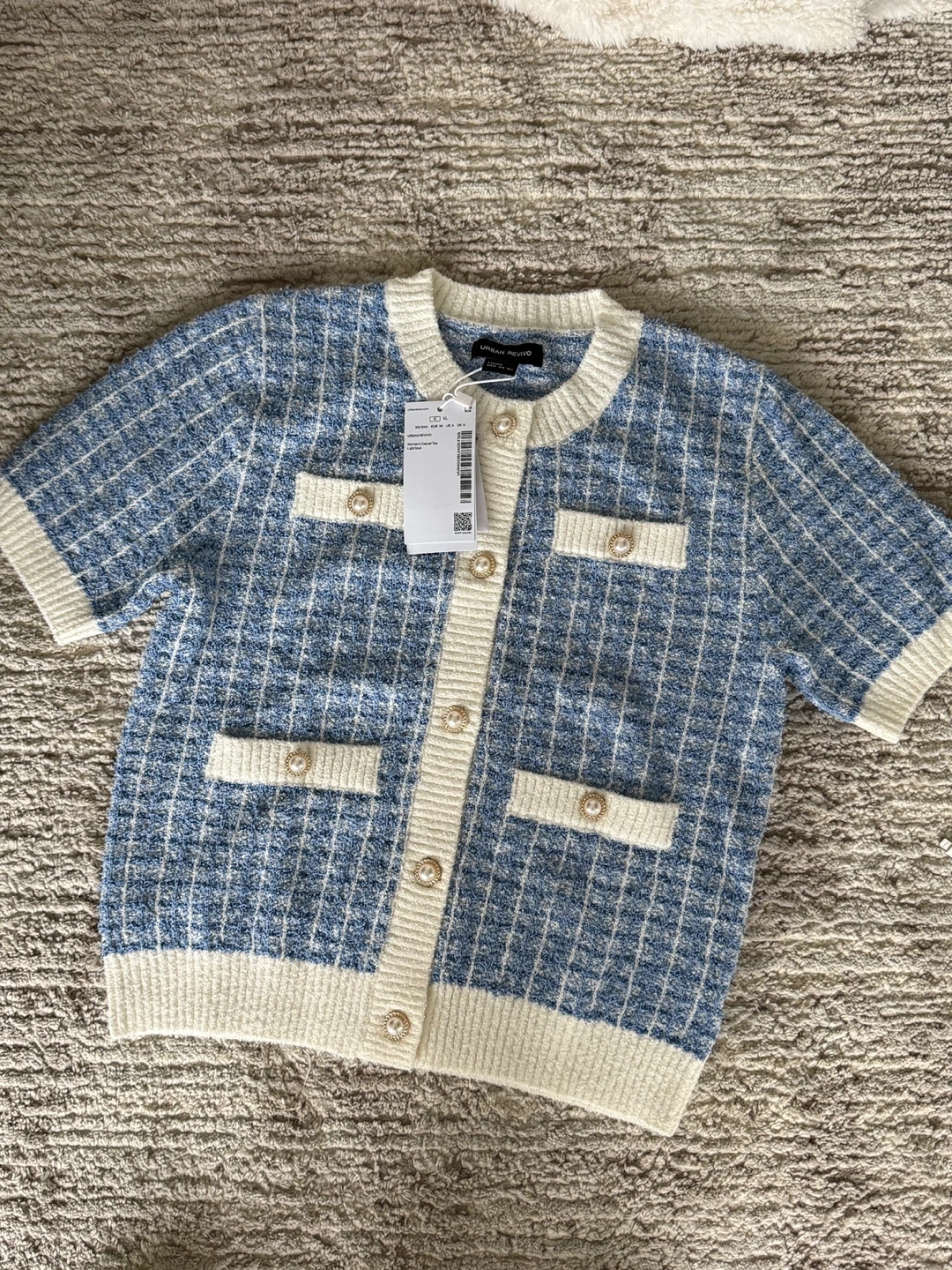 This is a cute blue tweed knit cardigan from UR. It's new with tag and has a lovely texture. Perfect for adding a touch of elegance to your outfit!