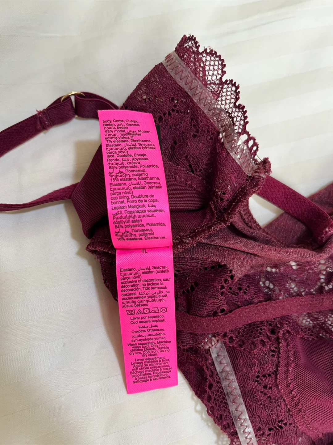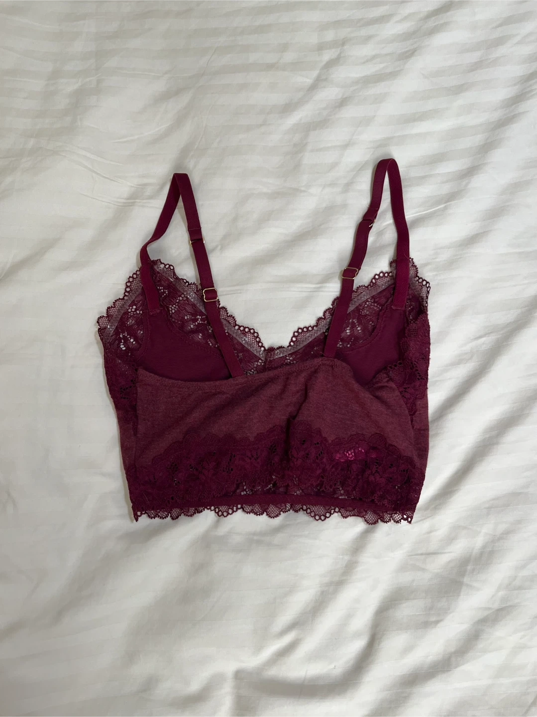 Chic deep red / purple bralette with intricate lace detailing. Offers both comfort and elegance.