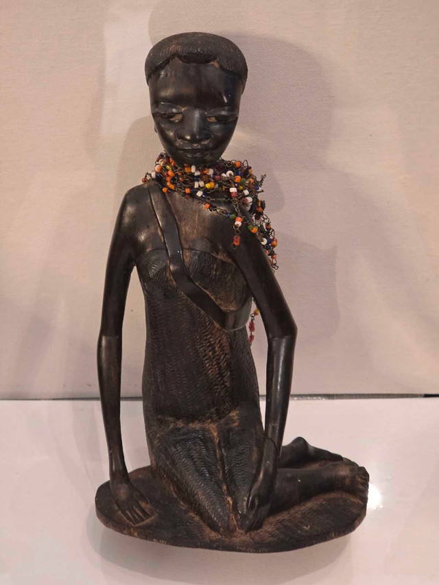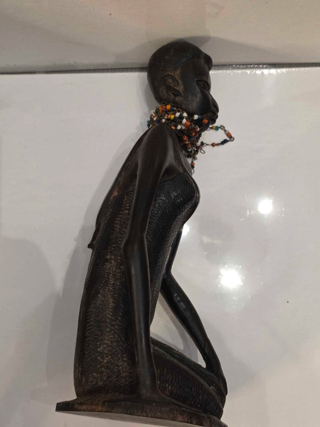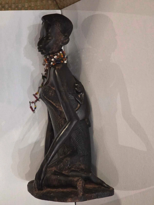 This striking 10-inch African wood carving depicts a mother carrying her child, adorned with a beaded necklace. This statue is in used condition, but well cared for. This piece adds a touch of cultural elegance to any space. * Material: Wood * Height: 10 inches * Theme: Mother and Child * Origin: Africa Looking to add a little global flair to your home? This carving is just the ticket. Please note that if the ad is up, the statue is still available for purchase! Based on similar items I've seen on Kijiji, I've priced this competitively.