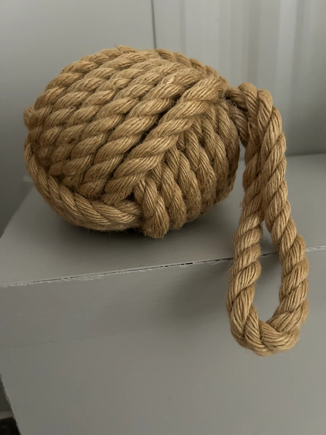 Photo # 3 displays the round, weighted rope door stop. Works like a charm. Inside or on the patio.