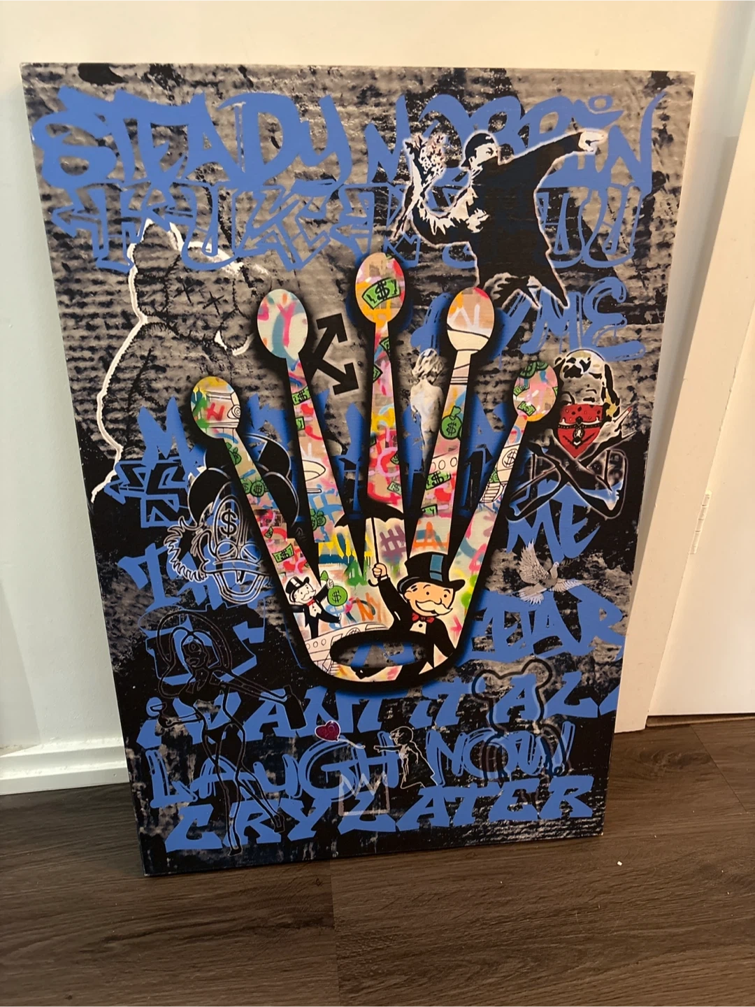 Unique canvas art with a Rolex-inspired design! Features street art style with recognizable imagery. Great for adding a pop of colour and urban flair to any room