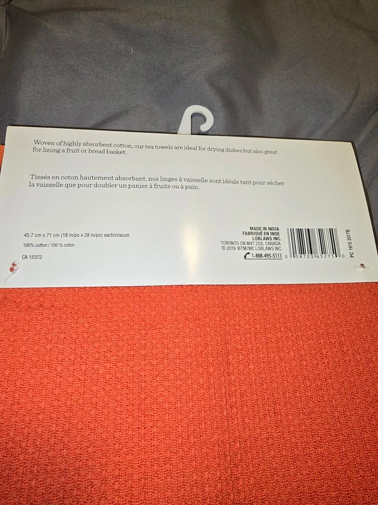 923These President's Choice tea towels are brand new and come in a set of 2! They're made of 100% cotton and measure approximately 45.7 cm x 71 cm (18 in x 28 in). The towels are highly absorbent and ideal for drying dishes or lining a fruit or bread basket. One towel has a lovely floral design, while the other is a solid orange colour, both colour's are rich and vibrant. Perfect for adding a touch of style to your kitchen!