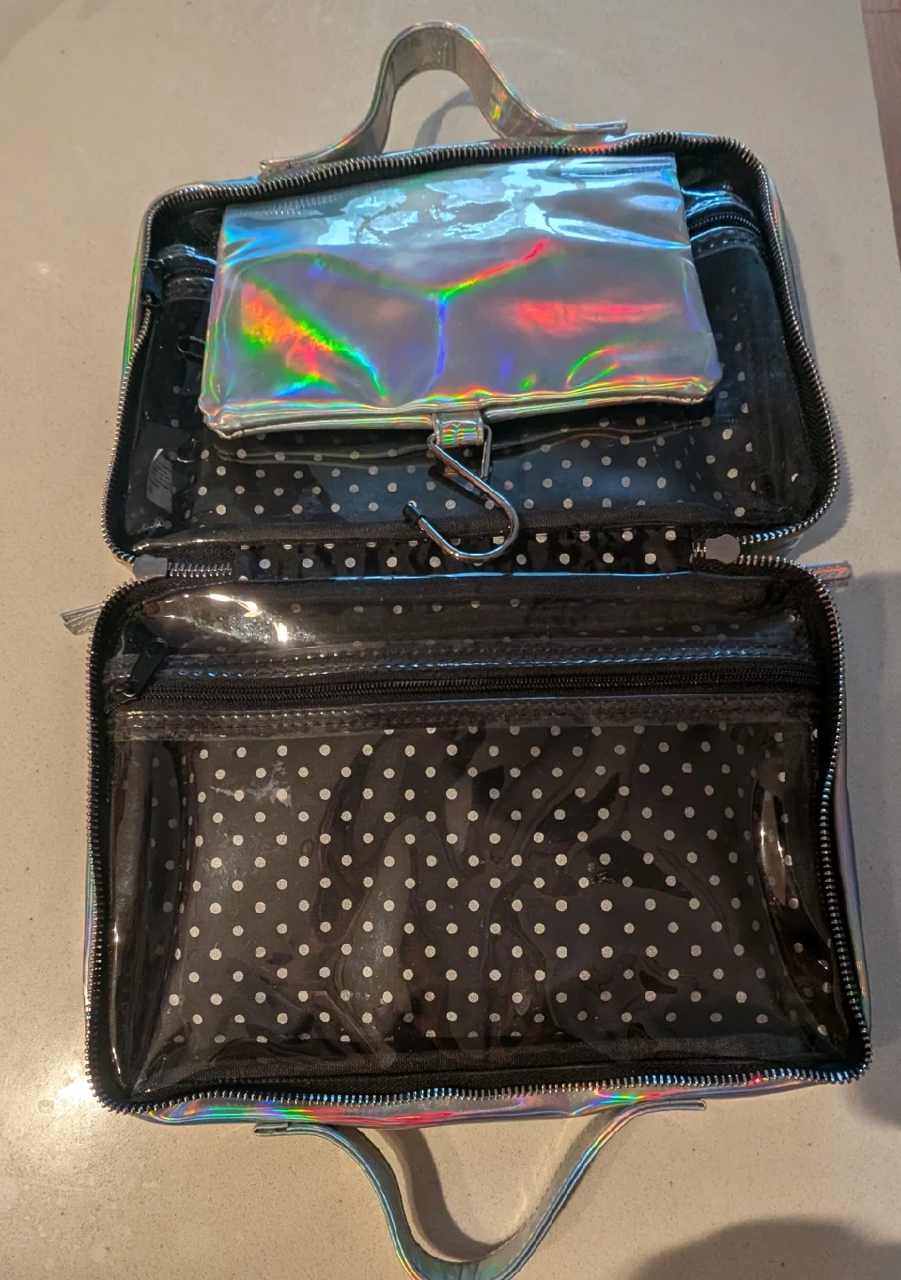 Selling a Victoria's Secret iridescent hanging travel cosmetic bag! It's perfect for keeping all your beauty essentials organized while you're on the go. The bag features a stylish iridescent exterior and a convenient hanging design for easy access to your items
