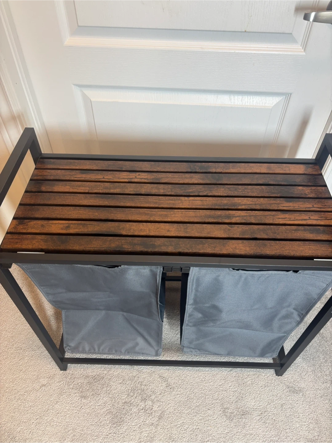 This VASAGLE double laundry hamper sorter is perfect for keeping your laundry organized! It features a sturdy MDF and steel frame with a wooden top and two removable black laundry bags. The unit measures 73 cm wide, 33 cm deep, and 72 cm tall. The top shelf can hold up to 44 lbs, and the entire unit has a max static capacity of 66 lbs.