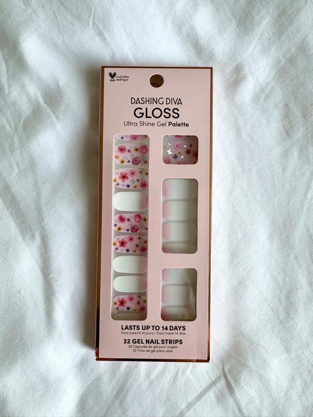 808New Dashing Diva Gloss Ultra Shine Gel Palette nail strips in Flower Crown. They last up to 14 days. - Salon Gel Effects - No Soak Off Removal - Chip-Resistant Shine Package contains 32 nail strips, prep pad, nail file, and instructions. Pickup in Richmond, cash only.