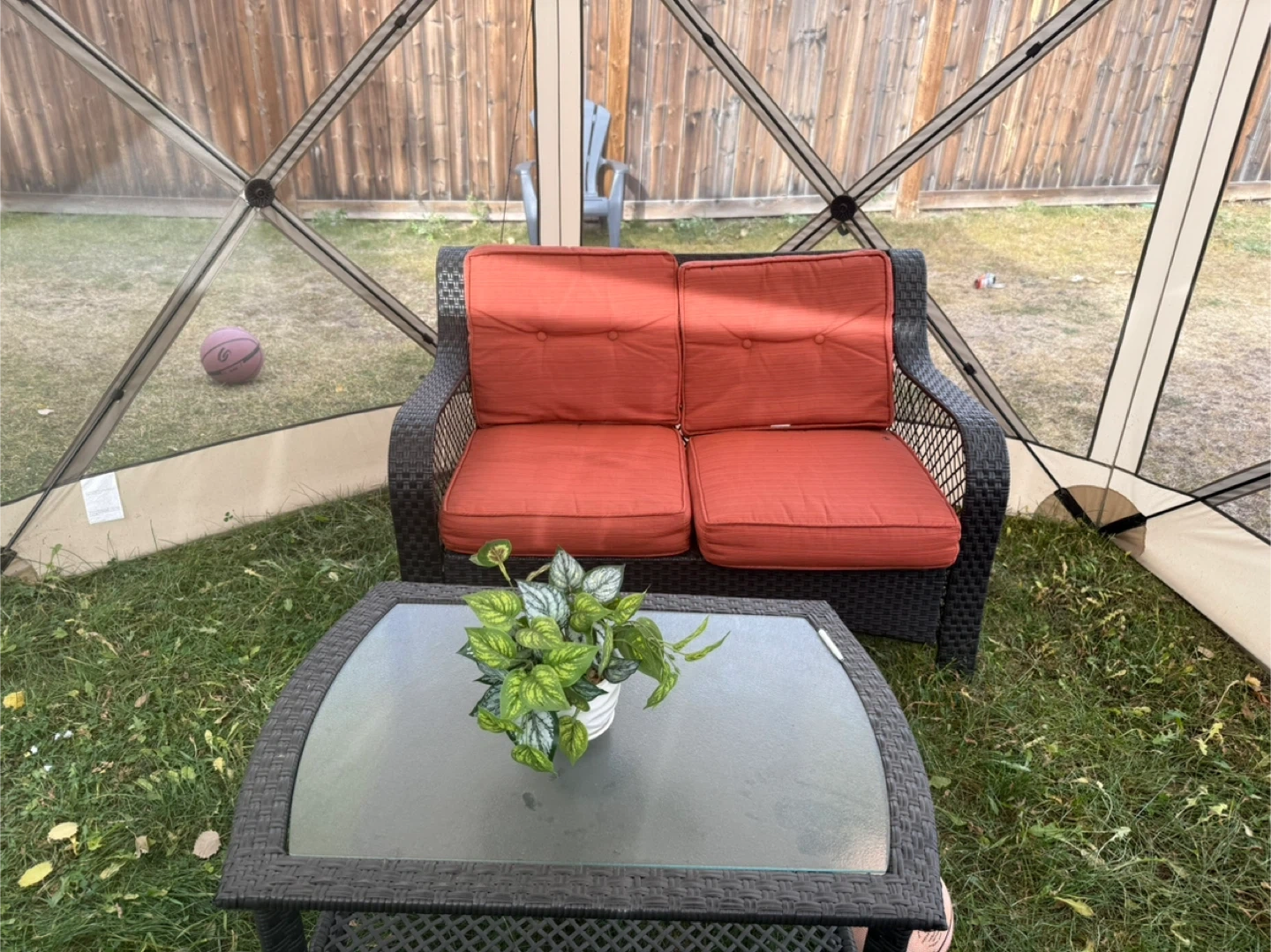 I'm selling a cozy outdoor patio set that includes a loveseat and two chairs. The loveseat has comfortable cushions, perfect for relaxing outdoors. The chairs are also in great condition and ready for a new home. They would be great for enjoying time outside!