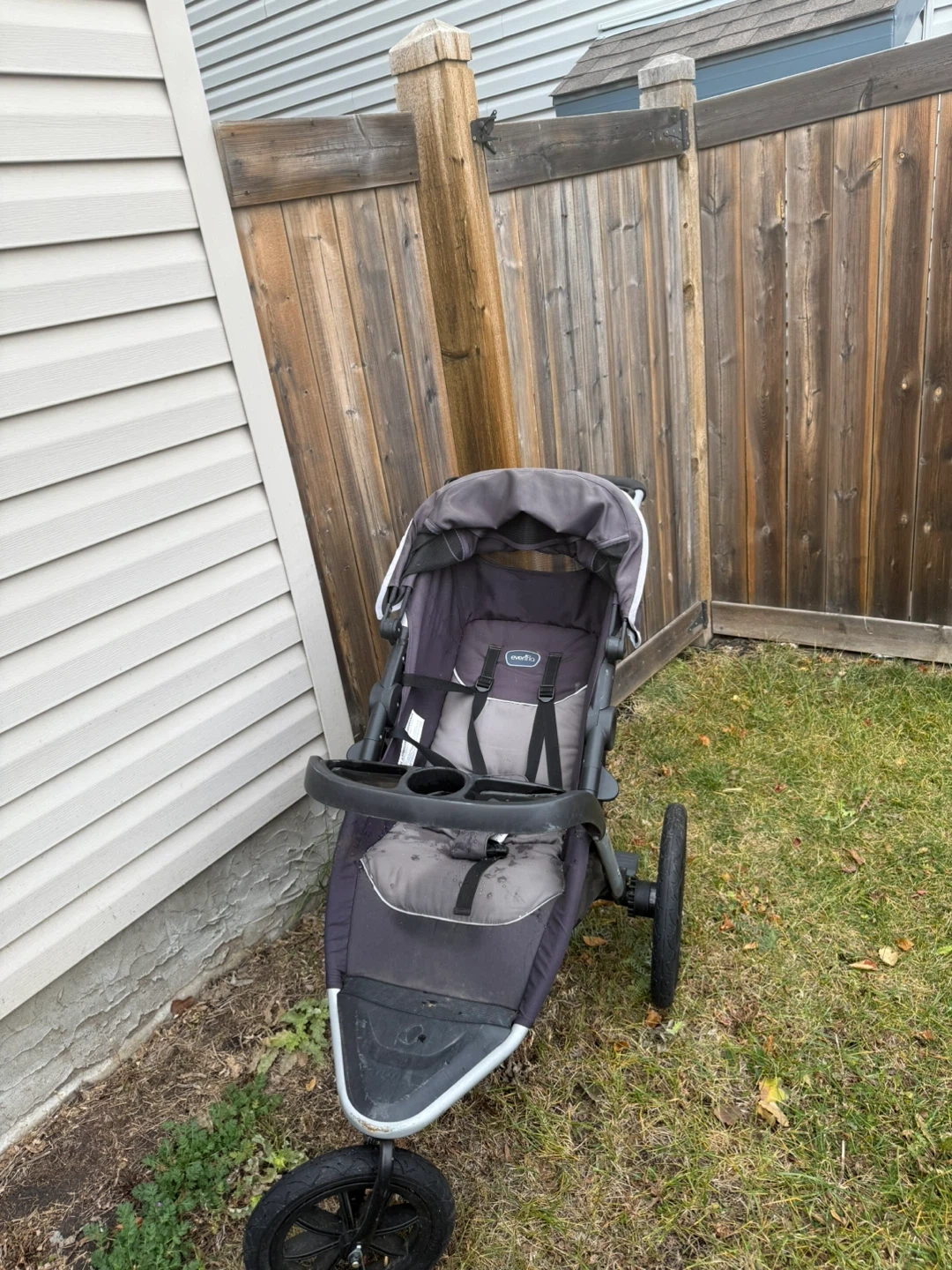 Selling an Evenflo single jogging stroller. It has a convenient tray with cup holders, and a comfortable seat for your little one. Great for walks or jogs around the neighbourhood!