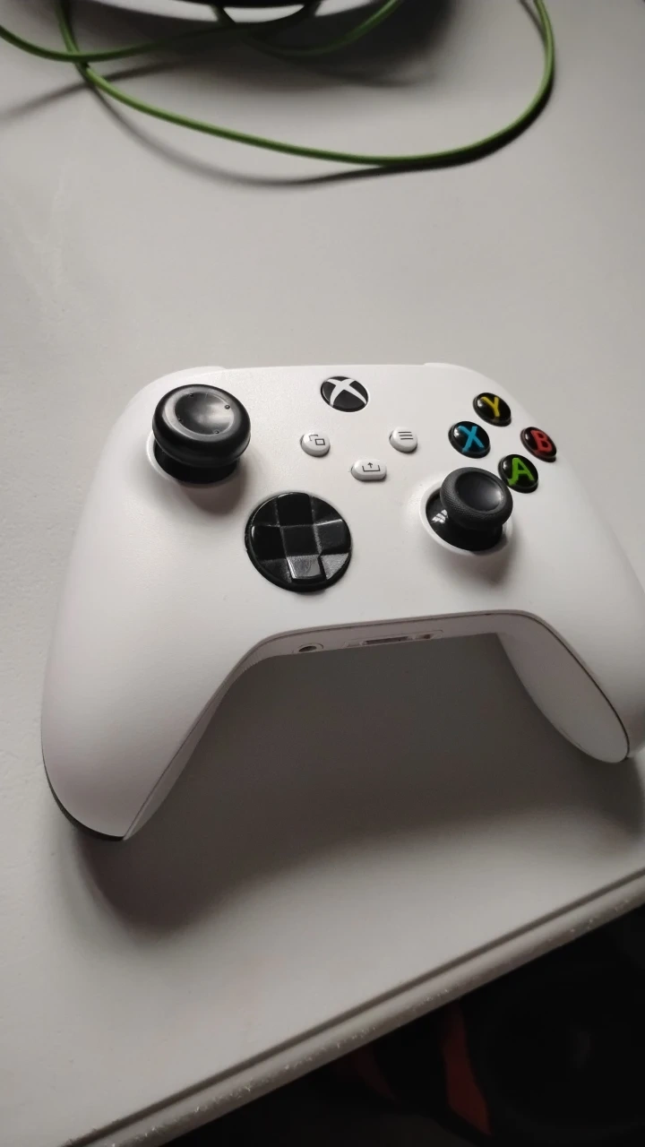 White Xbox series S Controller with black accents, has a joystick grip extender (control freaks brand) and a rechargeable Xbox branded battery so you can plug in controller to charge
