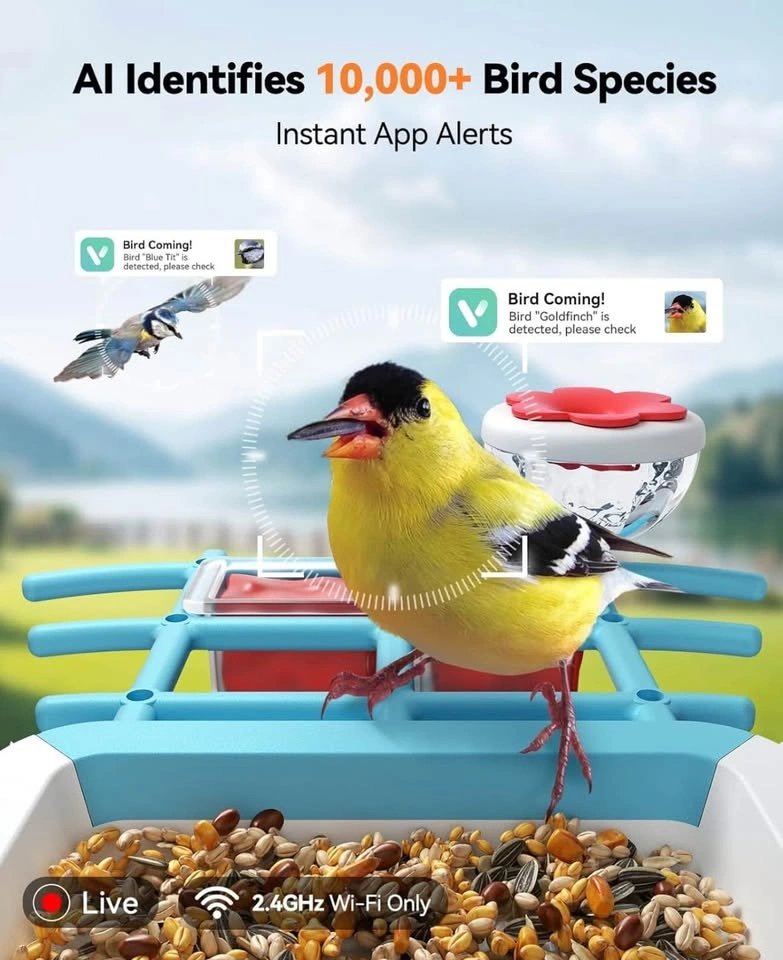 This smart bird feeder is equipped with an advanced AI camera that can automatically recognize over 10,000 bird species and capture clear pictures and videos(This version includes a 30-day trial of AI bird identification; you can upgrade to annual, or lifetime plans). Simply connect to the VicoHome app on your phone, and it will notify you in real time, allowing you to enjoy birdwatching anytime, anywhere. You'll never miss any birds. Please note that it is only compatible with 2.4GHz Wi-Fi (not compatible with 5GHz).