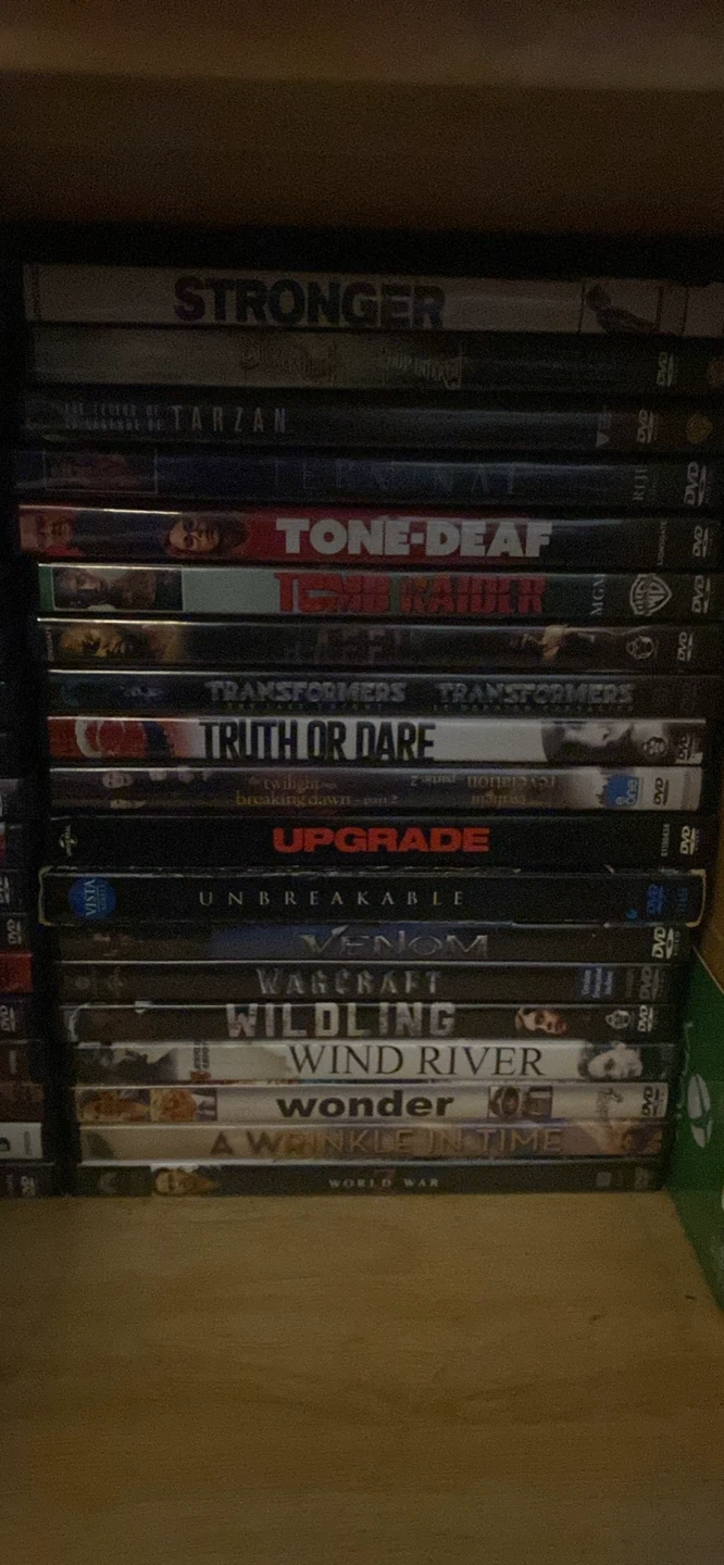 Selling a collection of DVDs. Titles include Stronger, Tarzan, Tomb Raider, Transformers, and many more! Check out the photos to see all the movies available