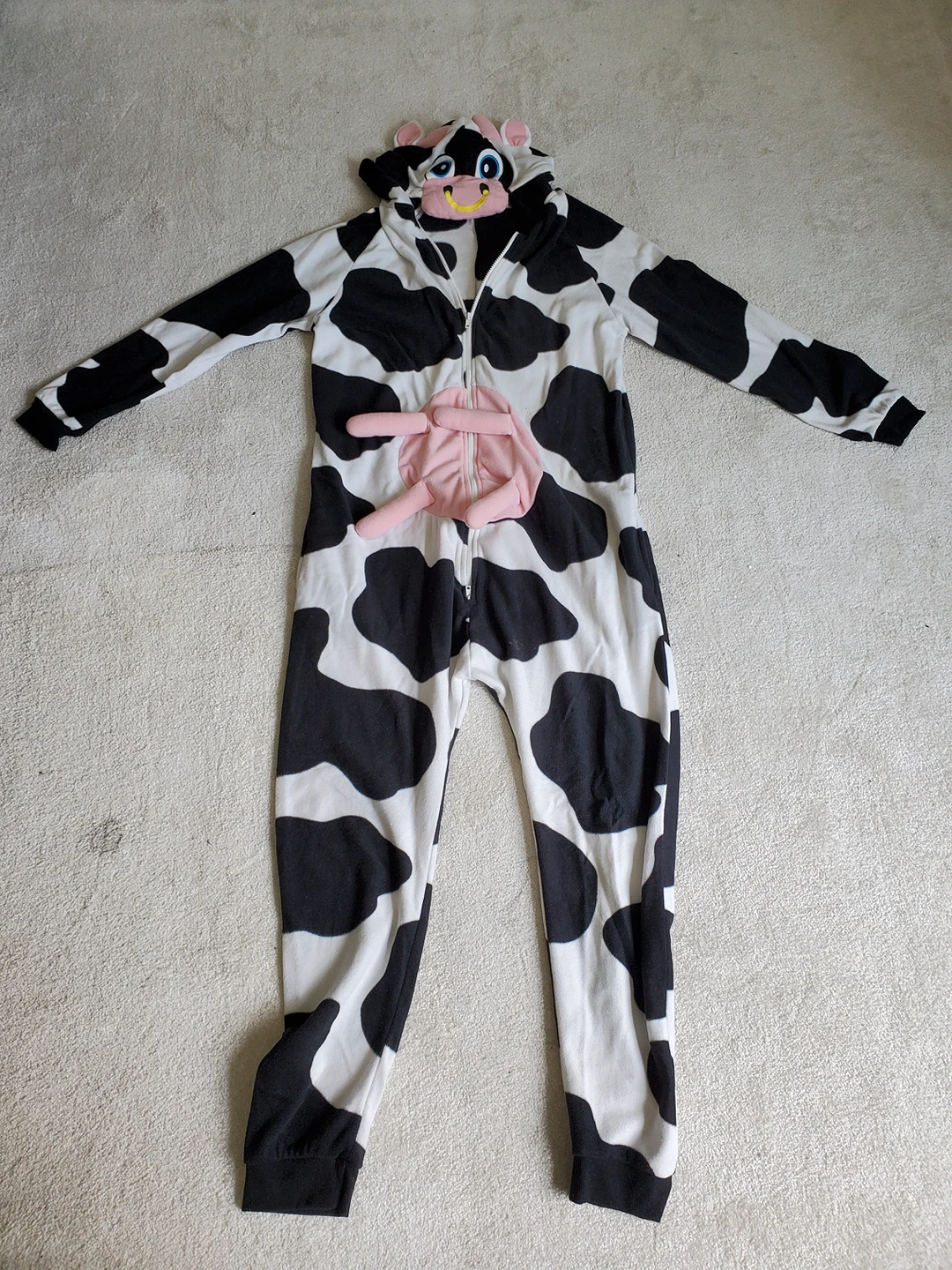 Yep that's right! A God damn cow costume, get it for free or pay $20-$30 when Halloween rolls around. Medium sized and fits me (5' 7", 160lbs man child). Has pockets and a double zipper.