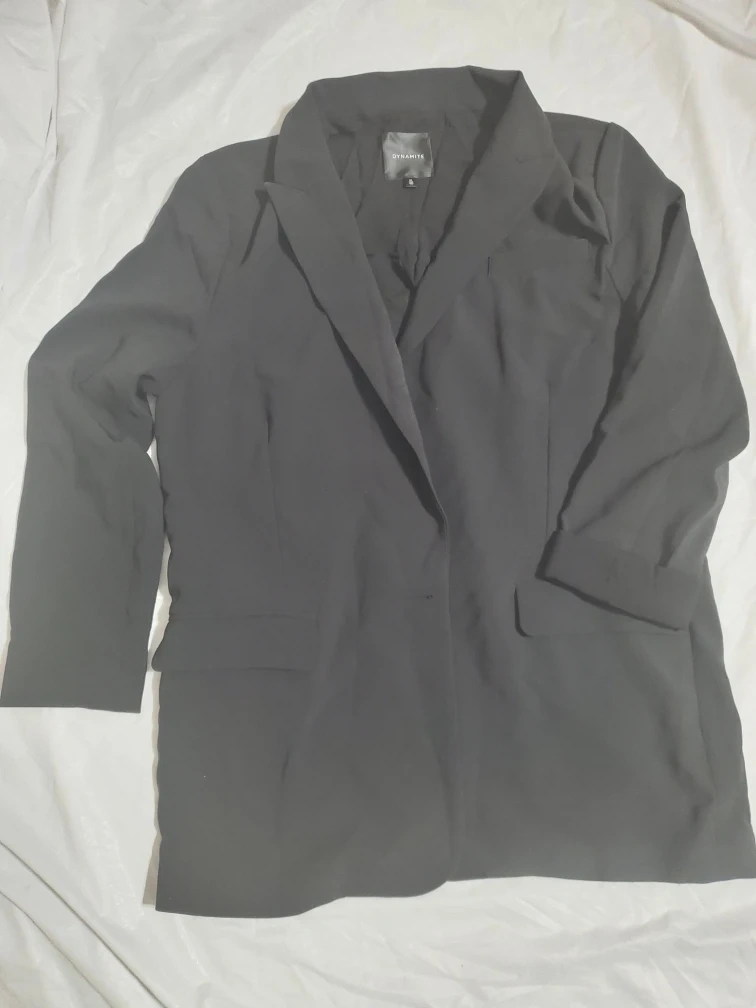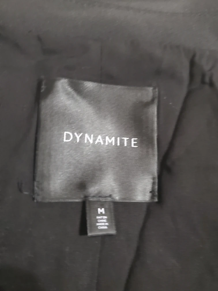 Selling a Dynamite black blazer in size medium. The blazer is made of 50% polyester, 37% recycled polyester, and 13% spandex. Wore only once pet and smoke free home.