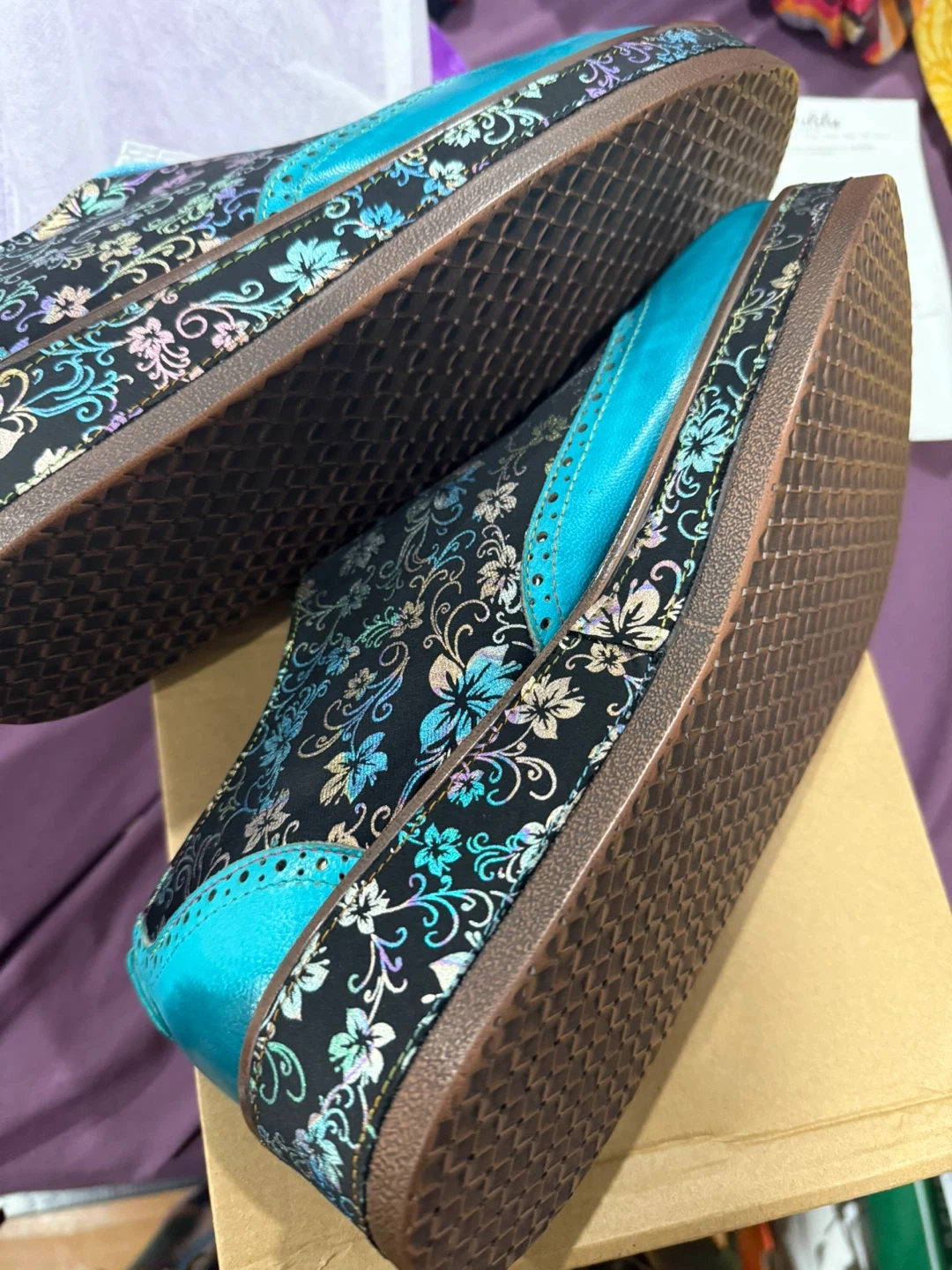 These shoes feature a beautiful floral print in turquoise and black. They look great and are in good condition!