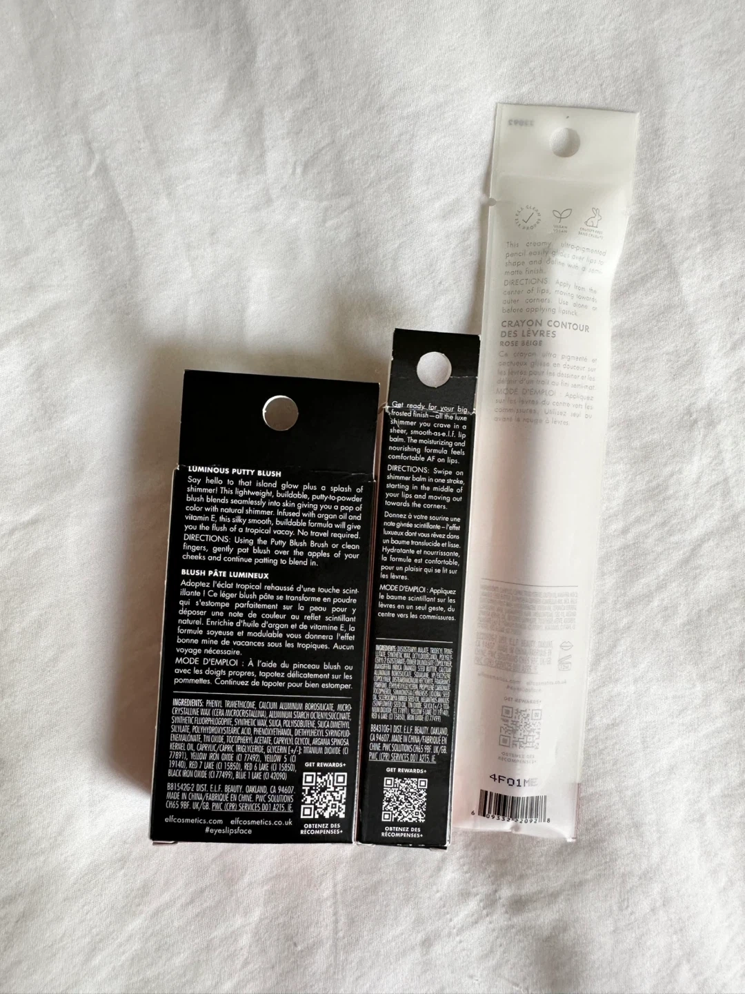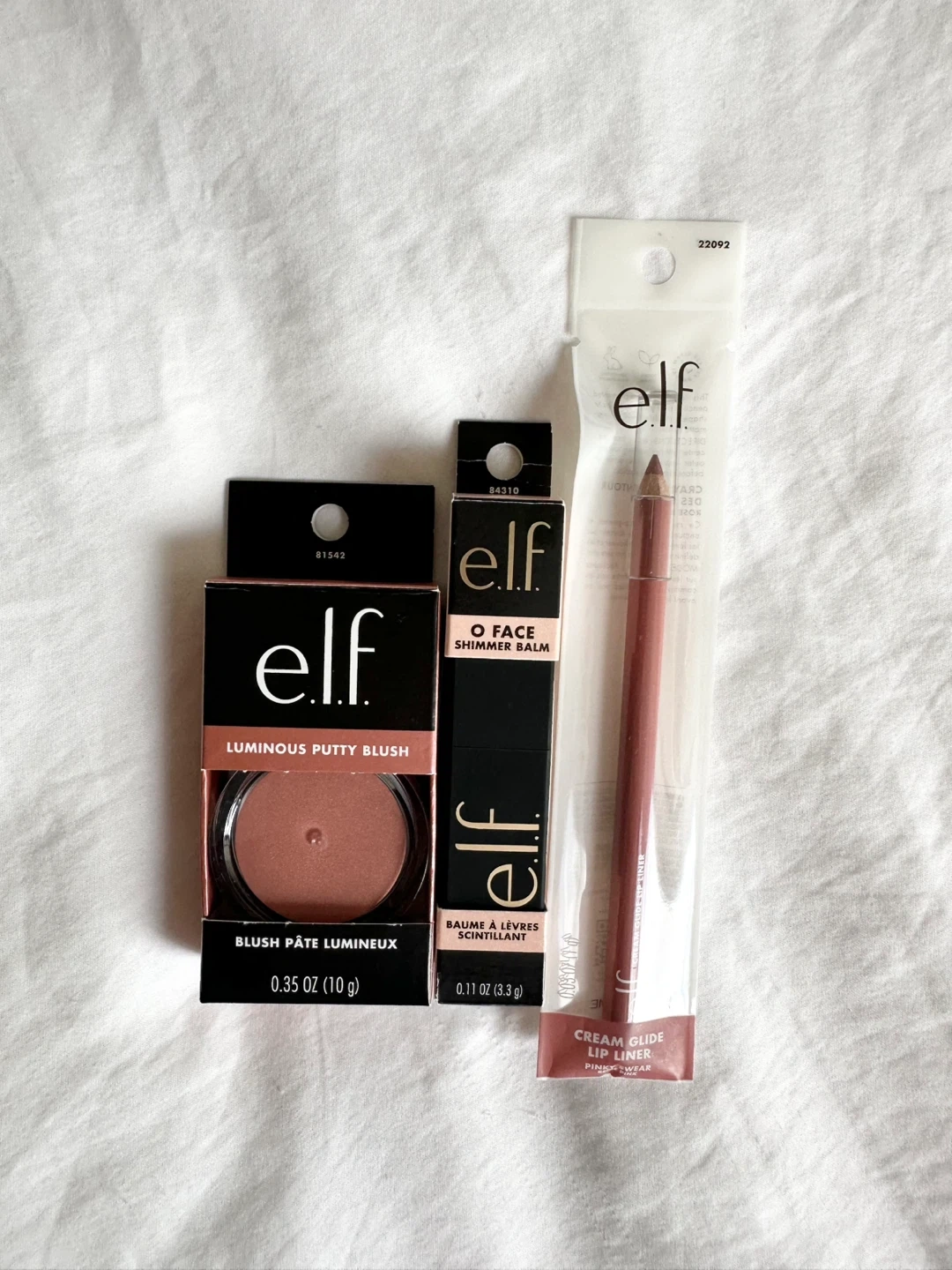 808New, unused set of e.l.f. makeup products: - Luminous Putty Blush in Maui (0.35oz/10g) - O Face Shimmer Balm in Pearlfection (0.11oz/3.3 g) - Cream Glide Lip Liner in Pinky Swear - Beige Pink (1g) Pickup in Richmond, cash only.