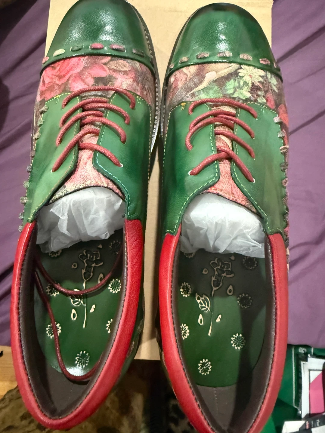 These are some really unique leather shoes with a fun floral pattern! They're mostly green with red accents and red laces. The shoes are in great condition and come with their original box