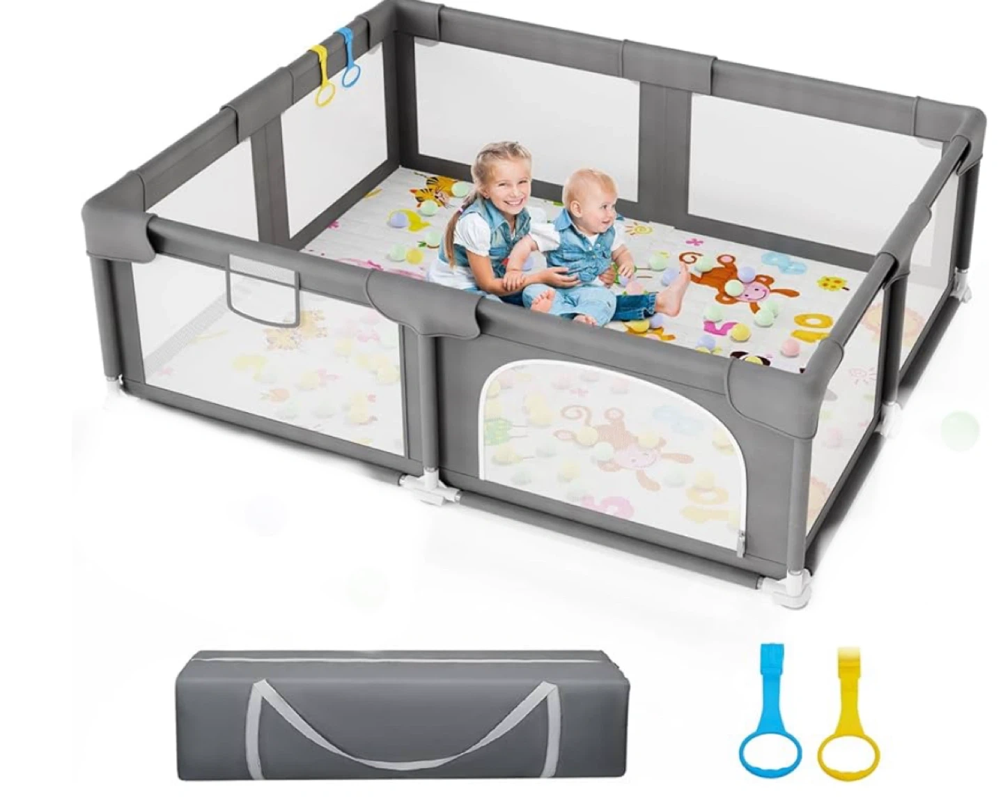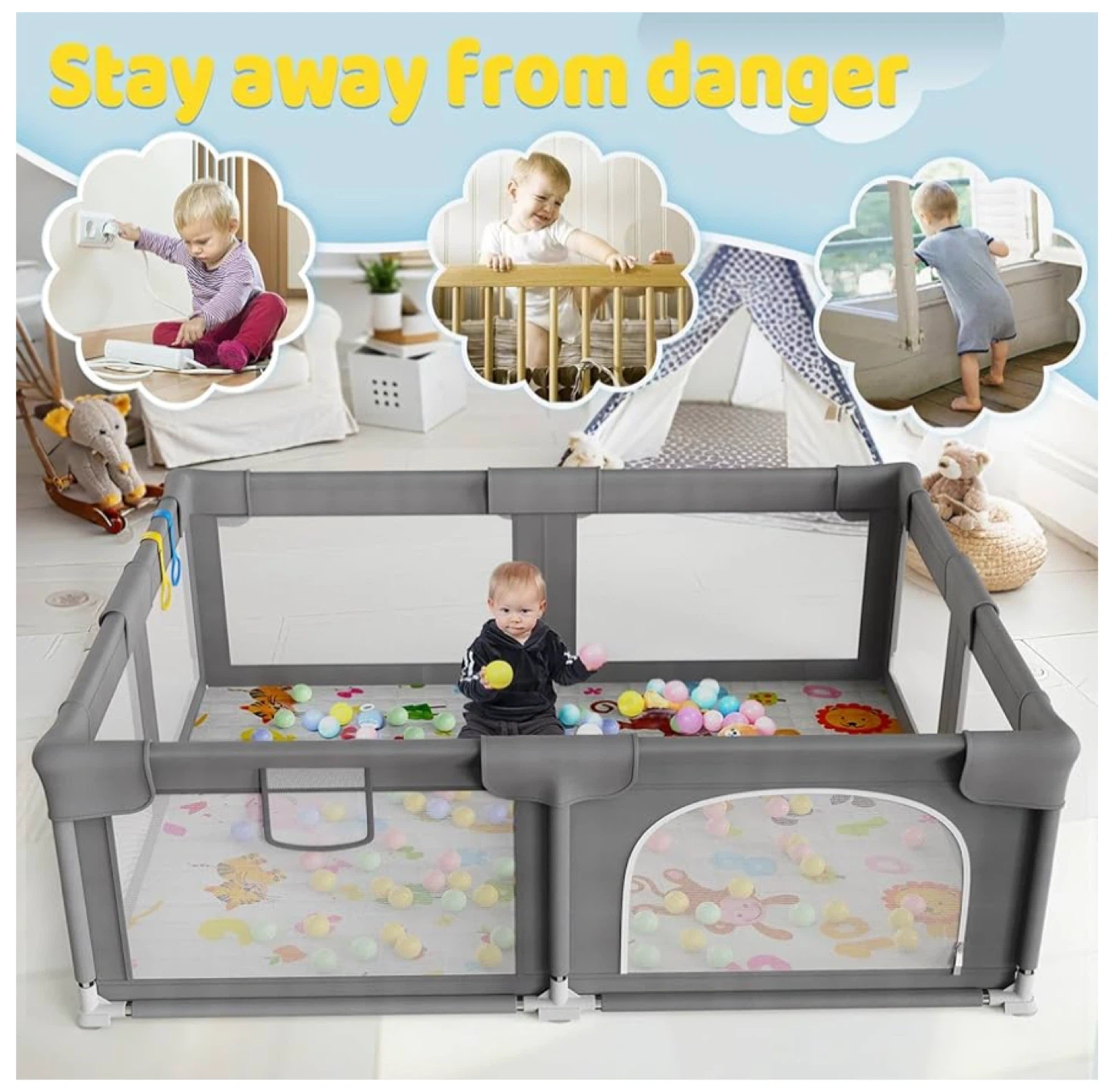[Give Baby a Playard] Palopalo Baby playpen is a safe activity center for your baby who is learning to crawl and wants to explore the world! Parents can also have their own time in peace! It is also a great ball pit for toddlers! ( Please NOTE: The inner size of playpen is 69x57in. The mat is not included in the package. If needed, please purchase a 69x57in play mat!)