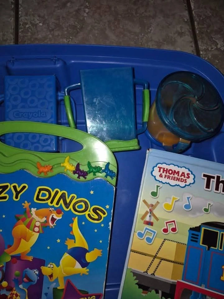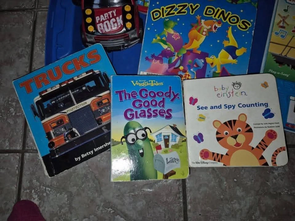 25Mixed lot Board books Toys Snack and juice box holders No batteries for piano book, truck or phone Thickson and Taunton. Pet and smoke free home. No holds. Fastest pickup.
