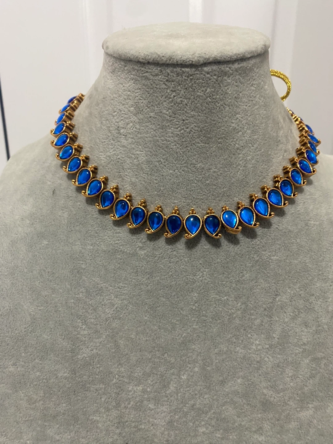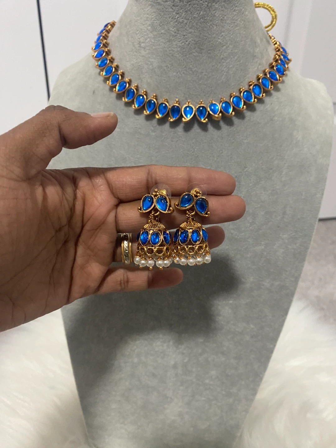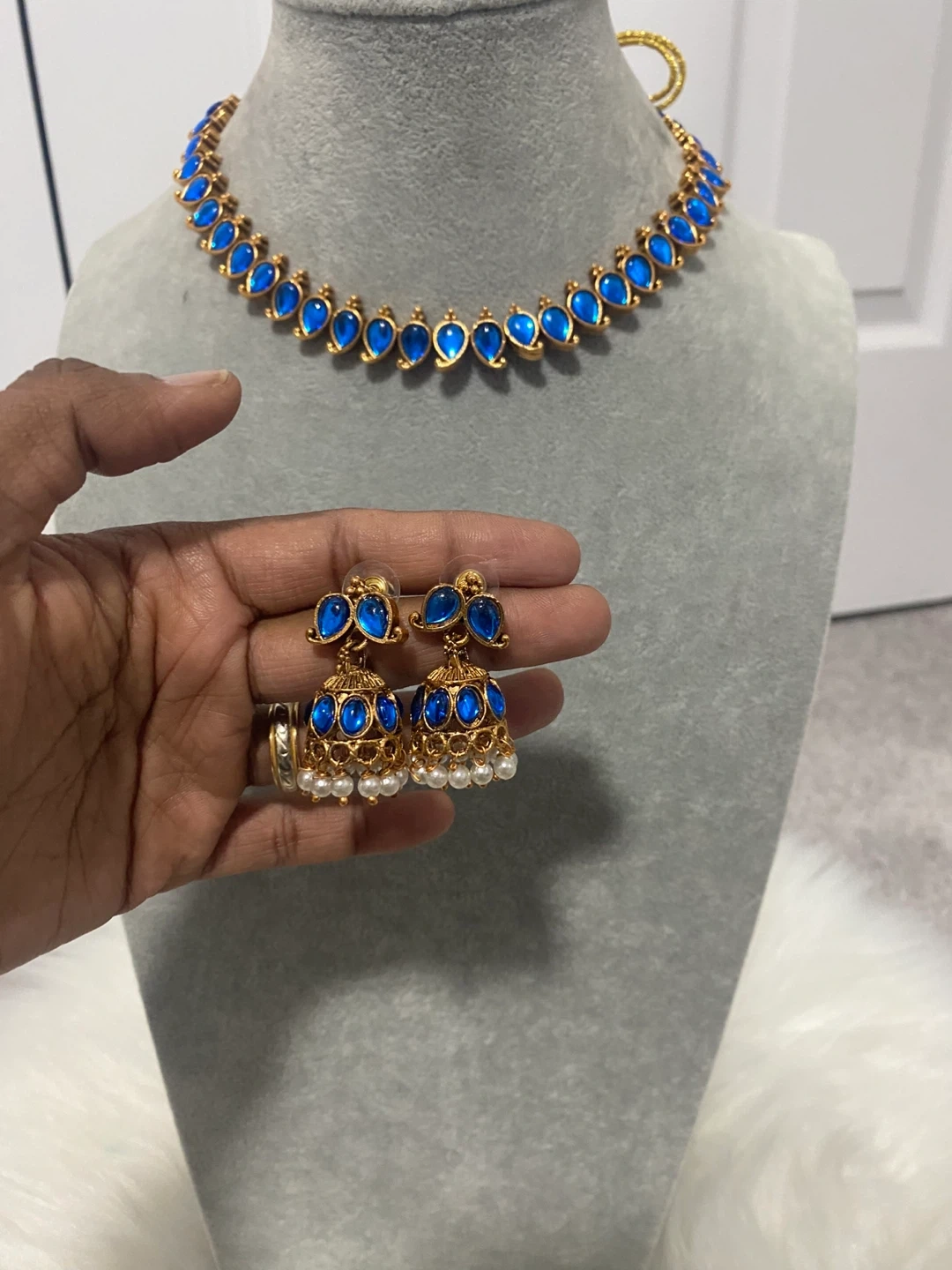 28Beautiful matching necklace and earrings set! The set features a gold-tone metal with vibrant blue stones and pearl accents on the earrings. Perfect for adding a pop of colour to any outfit