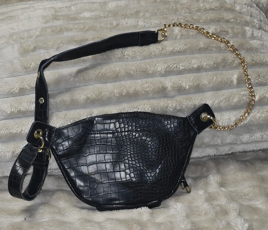 53Check out this stylish black belt bag! It features a cool croc-embossed texture and a chic gold chain detail. Perfect for keeping your essentials close while adding a touch of flair to your outfit
