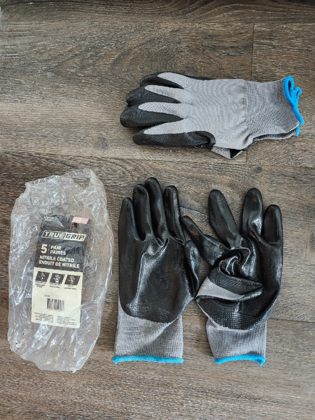 2 pairs unused True Grip nitrile coated gloves, from a pack of 5. These gloves are great for various tasks requiring hand protection. They are durable and provide a good grip, making them ideal for both indoor and outdoor use. Size large.