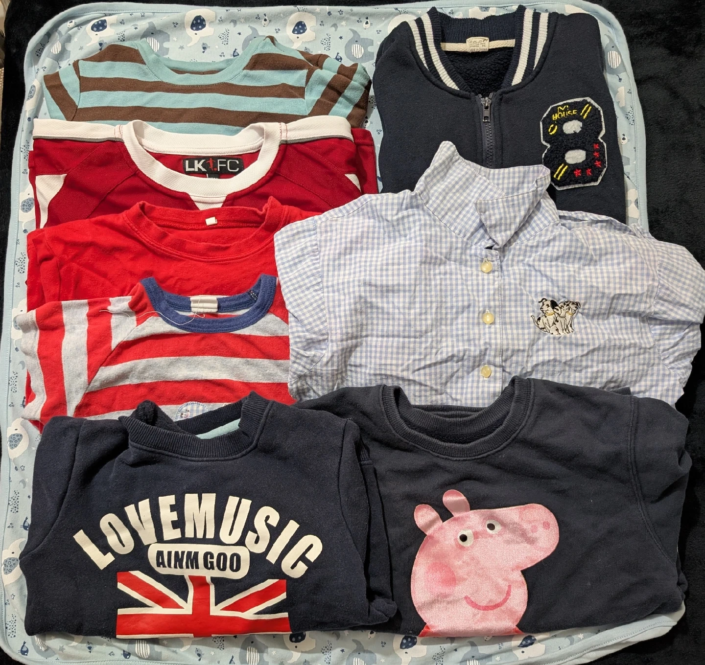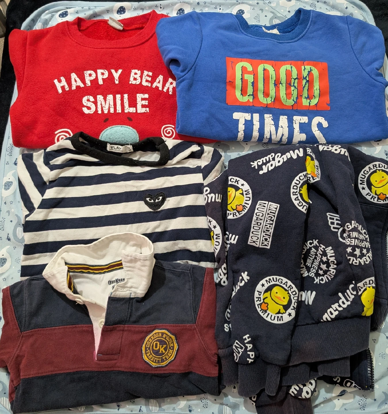 Selling a mixed lot of kids' clothing! There are various sizes and brands included, suitable for a range of ages. You'll find a variety of shirts, sweaters, and more. All items are in good, used condition and ready for a new home. Perfect for stocking up on everyday wear for your little one!