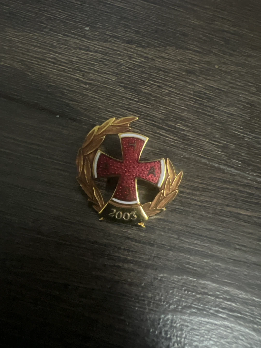Selling a vintage pin featuring a red cross design surrounded by a golden laurel wreath. The year '2003' is displayed at the bottom. A unique piece for collectors or those interested in historical memorabilia