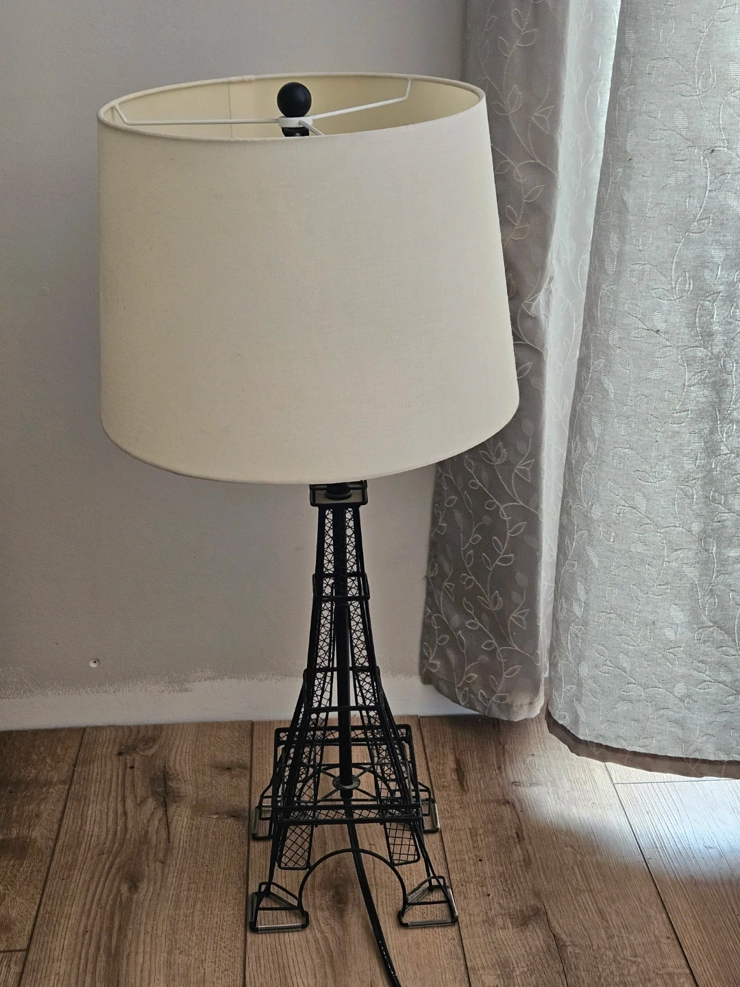 Selling a unique table lamp with an Eiffel Tower design! It's in great condition and would add a nice touch to any room. The shade is a neutral colour, and the base is a black metal.